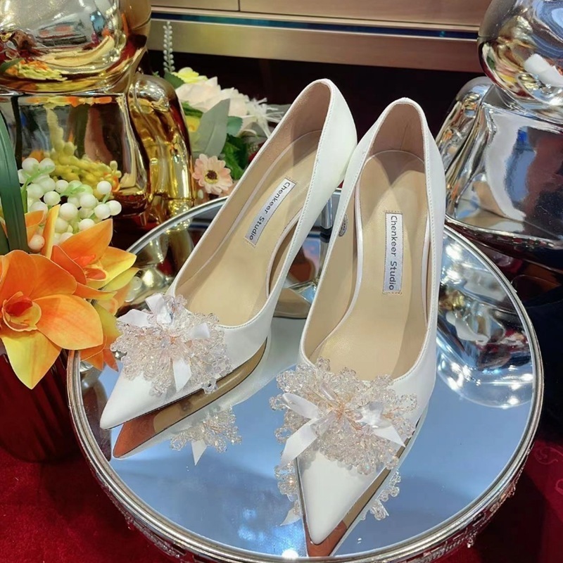 ウェディングシューズメインウェディングドレス 疲れた足のないツーウェアブライド2025ホワイトハイヒールの女性の薄いかかと