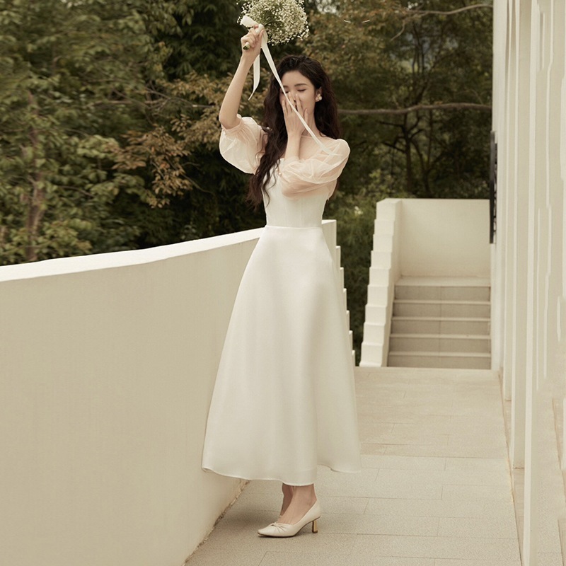 ライトウェディングドレスカラー登録小さな白いスカートスモールシンなサテン気質森スーパーエンゲージメントドレススプリング