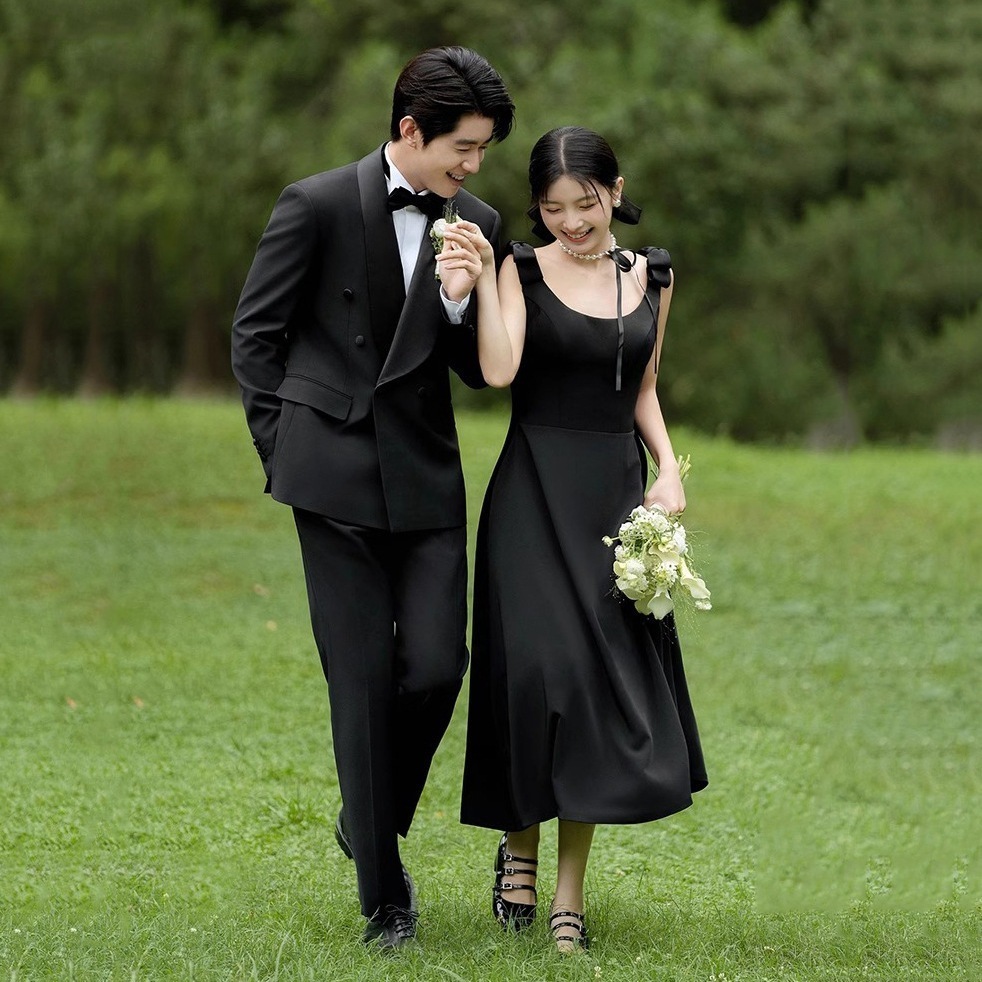 写真写真テーマ服ウェディングドレス写真カッブラックサテンサスペンダードレス