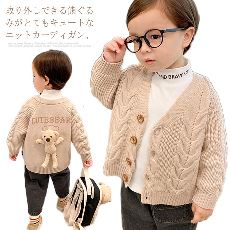 ベビー服 ニットカーディガン ニット アウター ケーブル編み Vネック ラグランスリーブ クマ おし