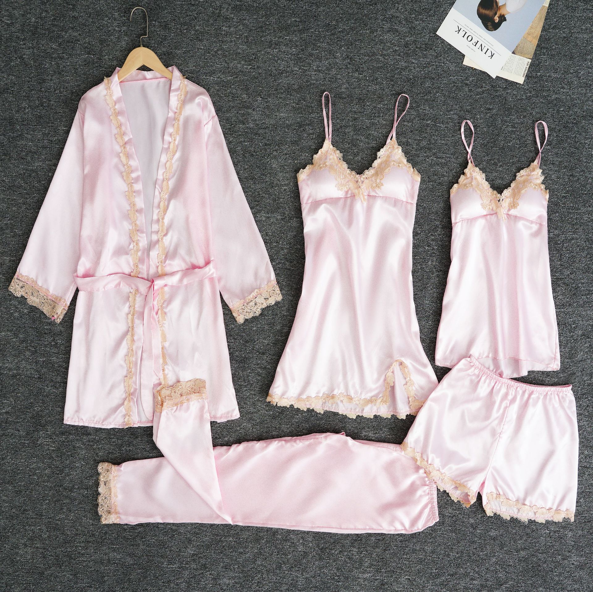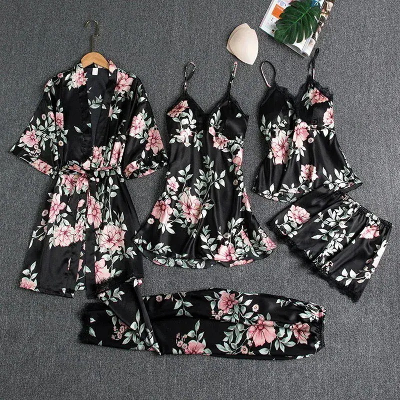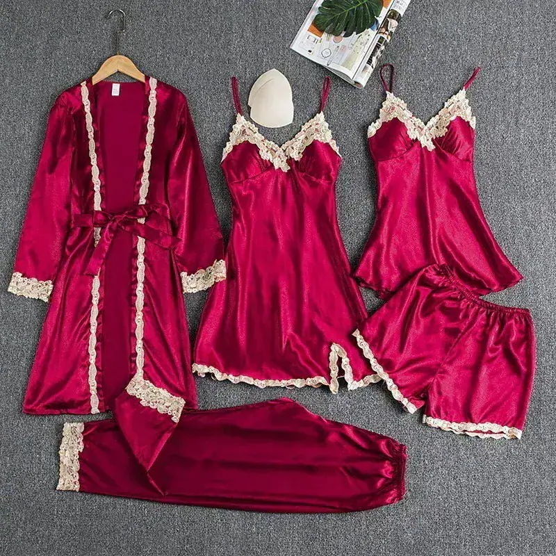 胸パッド付き ルームウェア 5点セット レディース サテン パジャマ トップス キャミソール ショートパンツ パンツ ガウン セット レース 刺繍 秋冬 寝巻き 部屋 福袋