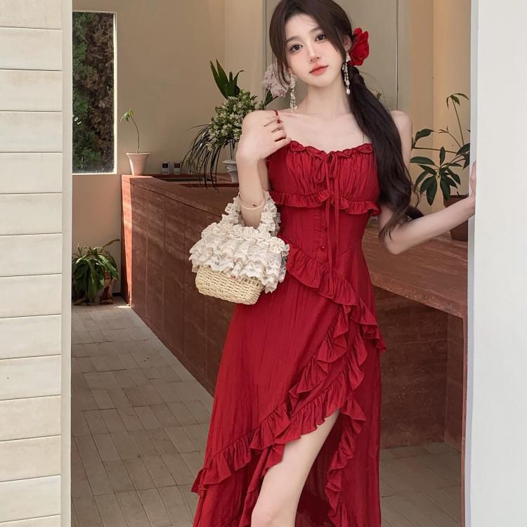 フランスのレトロレッド気質甘くてスパイシーなスーパーフェアリーセクシーな不規則なサスペンダードレス