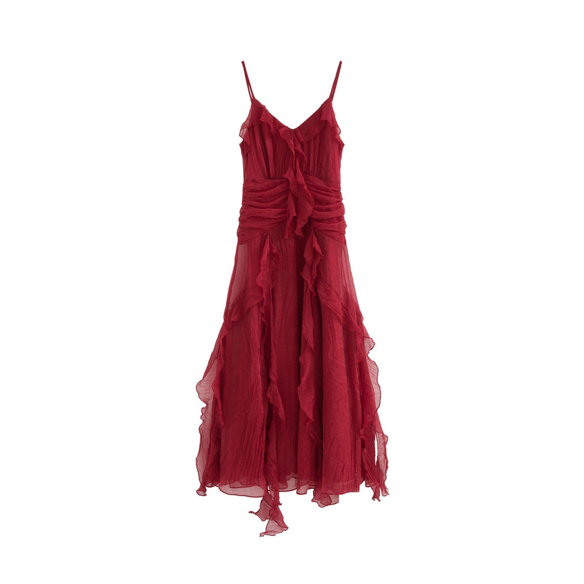 フランスのレトロレッドウエスト閉じたスリミングフリルの長い長いサスペンダードレス