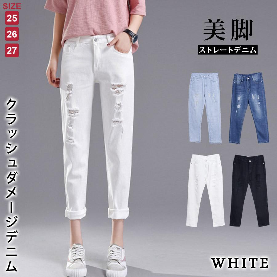 デニムパンツ レディース 春 黒 白 ダメージパンツ ブラック ブルー ホワイト ダメージデニム ジーンズ ジーパン クラッシュデニム 20代