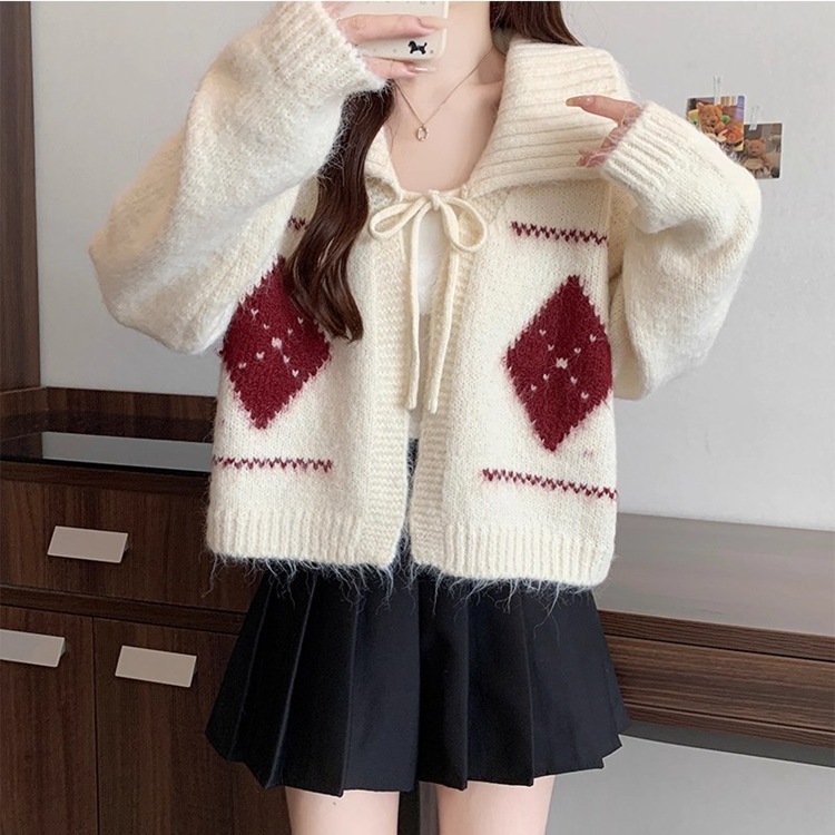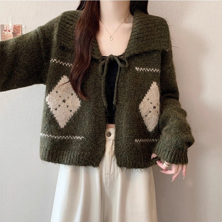 カーディガン韓国風 菱形 襟付き 紐付きセーター レディース 冬 ゆったり 柔らか ニットカーディガン