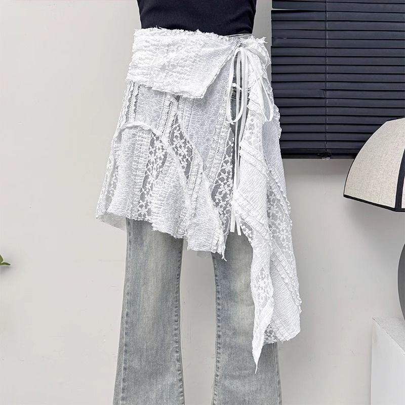 ベルトフレンチイレギュラー中空かぎ針編みレースハーフスカート女性ドローストリングタイオーバーレイおならカーテンショートスカート