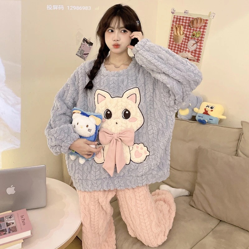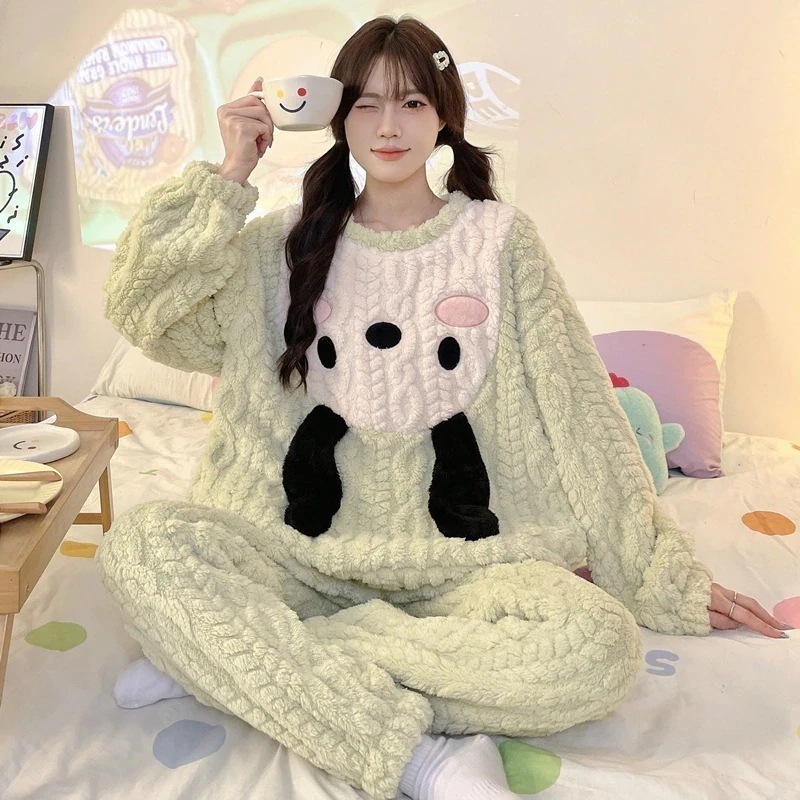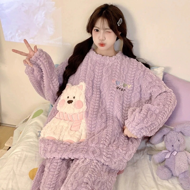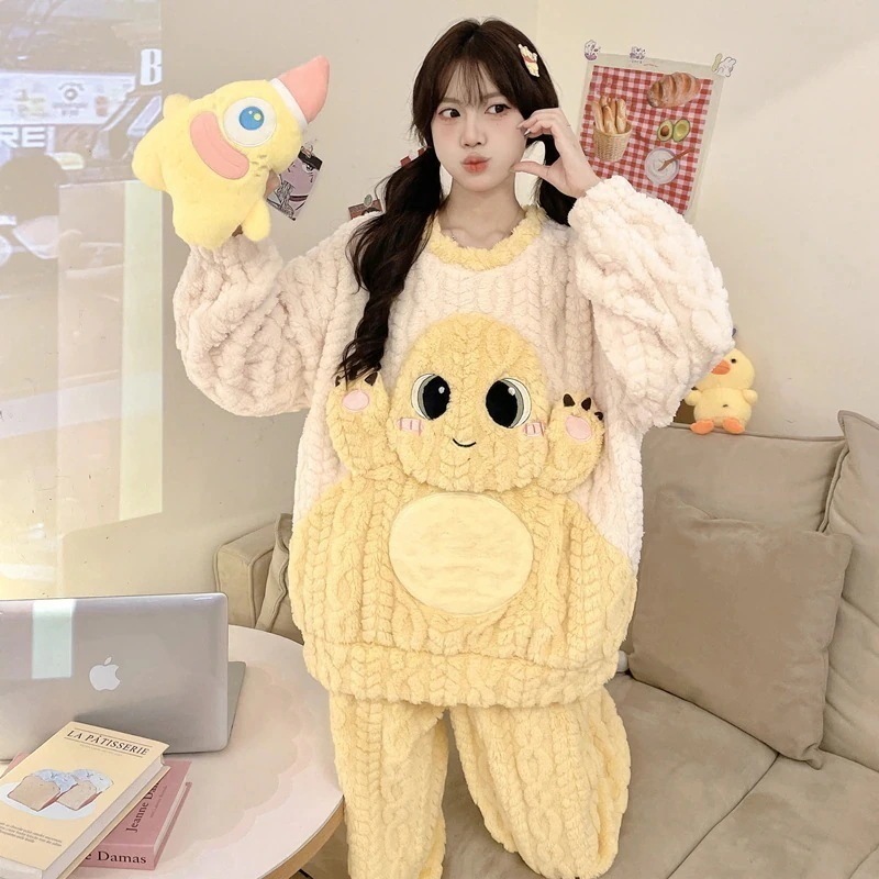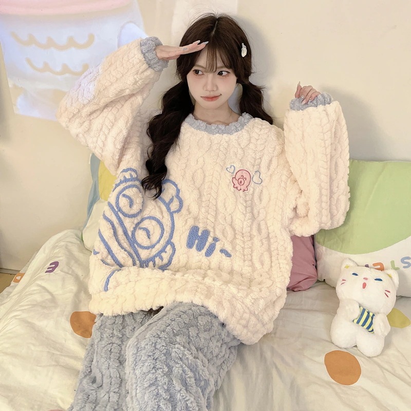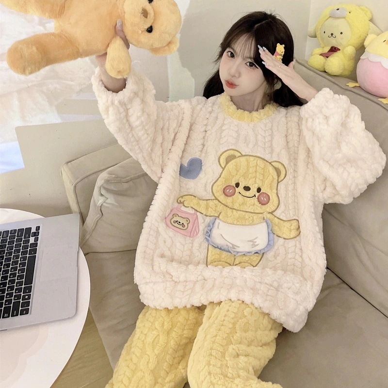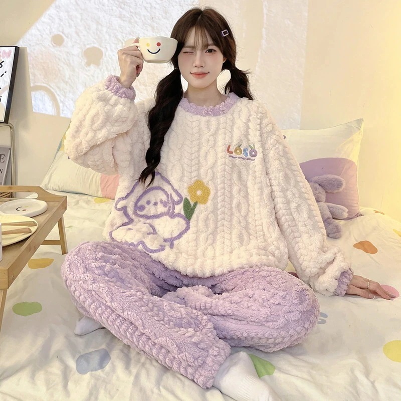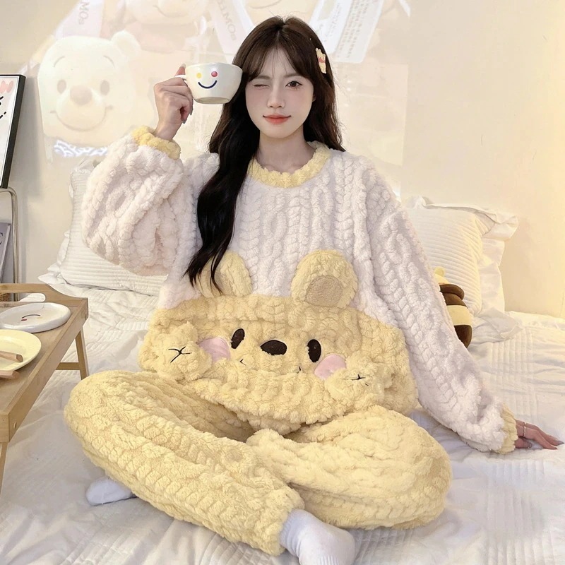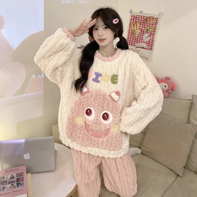 女性用コーラルベルベットパジャマ厚みベルベット漫画かわいいスタイルホーム服暖かいラウンドネックスーツ 【メガ割】