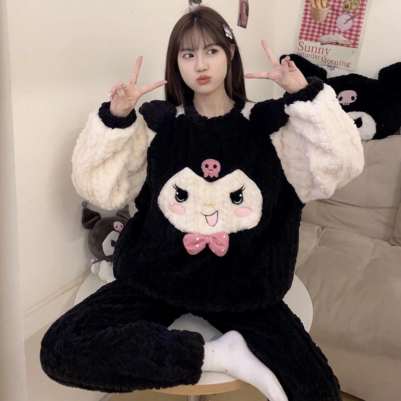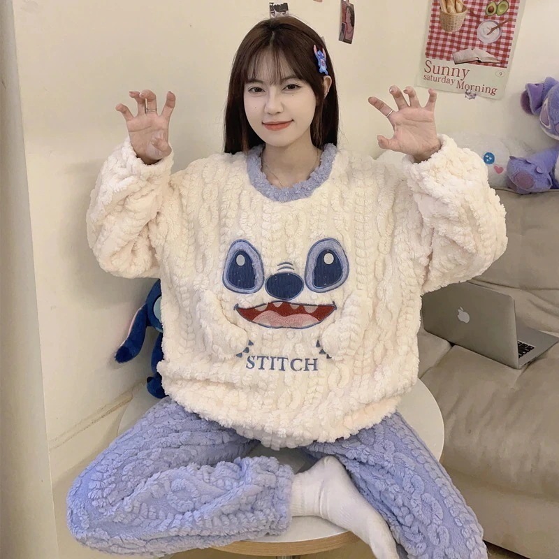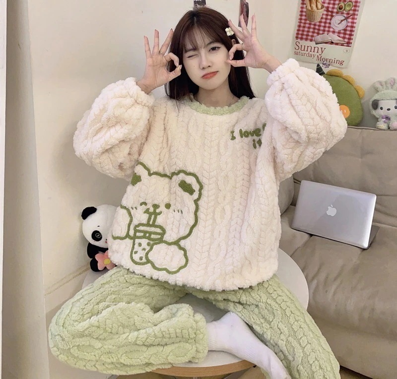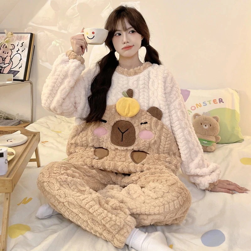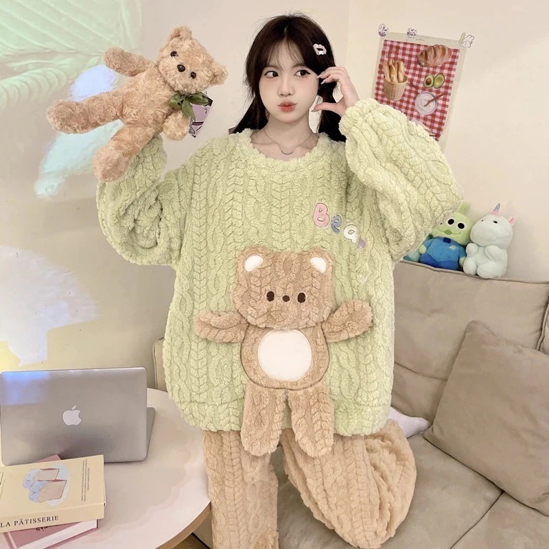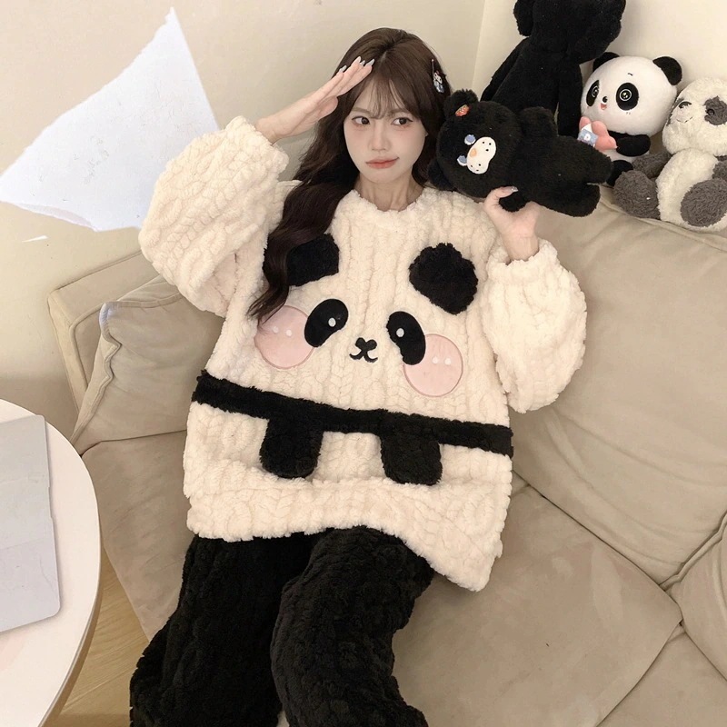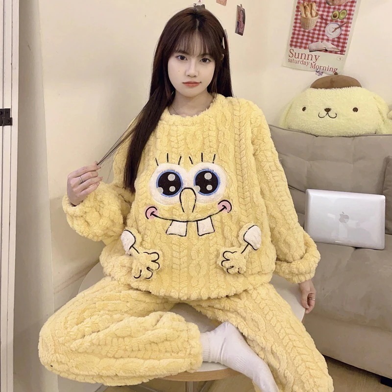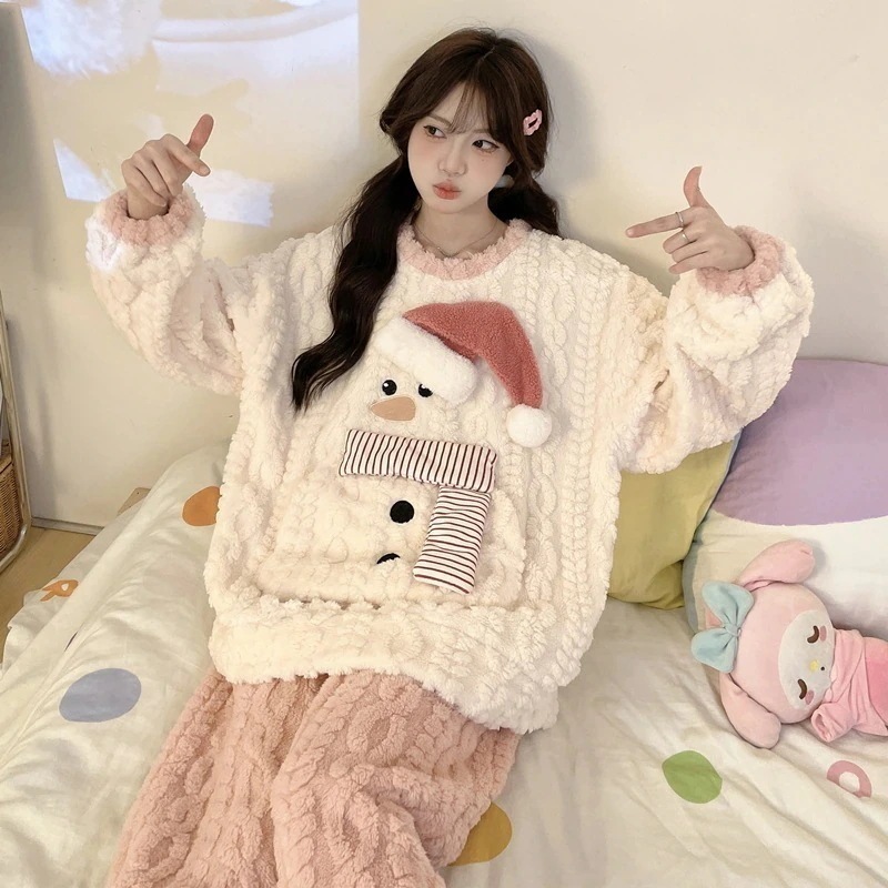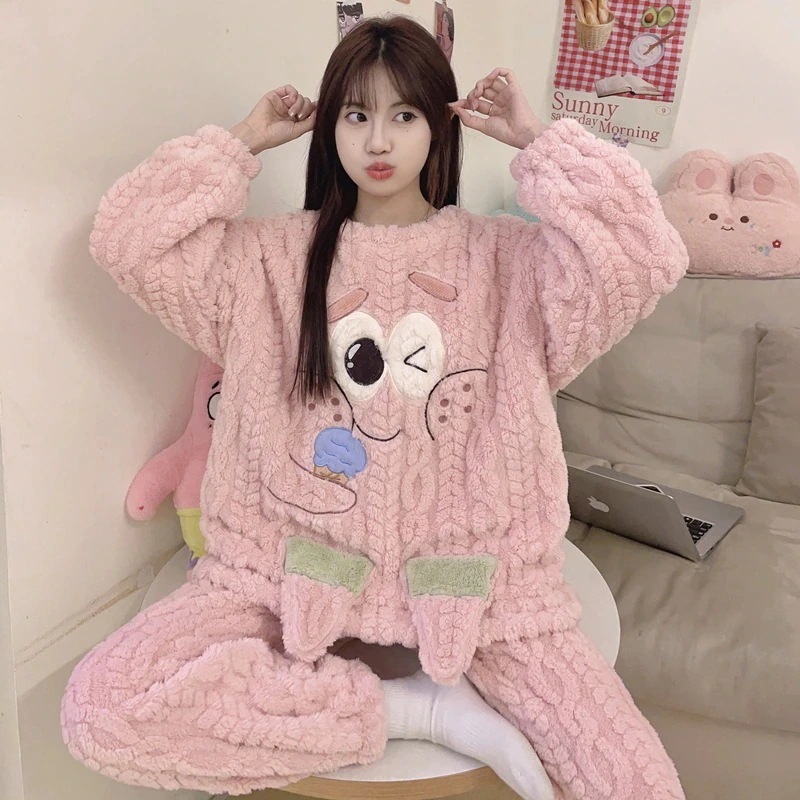 女性用コーラルベルベットパジャマ厚みベルベット漫画かわいいスタイルホーム服暖かいラウンドネックスーツ 【メガ割】