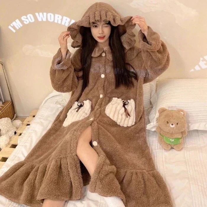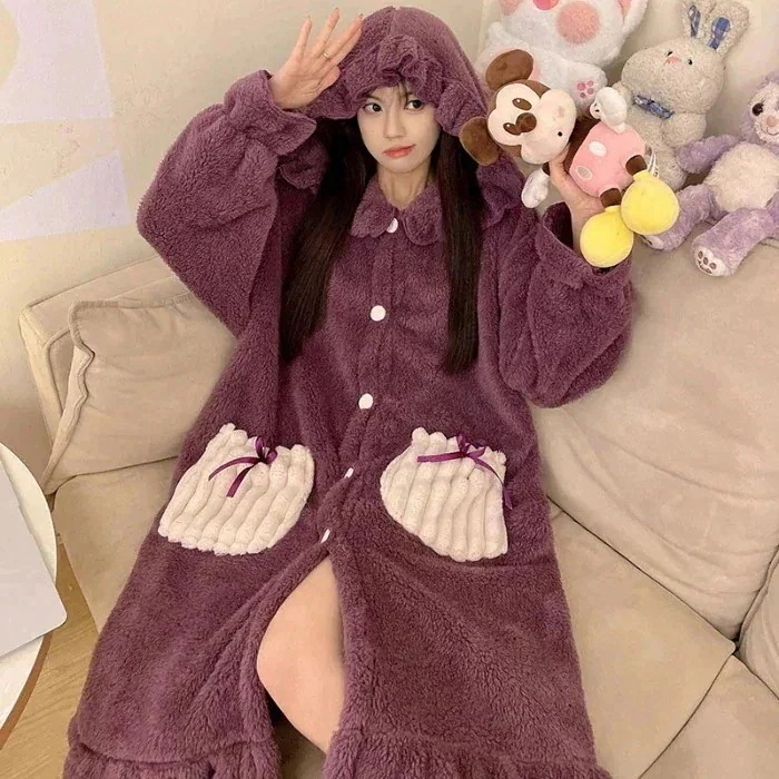 女性用カジュアルナイトガウンフランネル肥厚ルーズローブフード付きパジャマコーラルベルベットナイトガウン女性用 【メガ割】