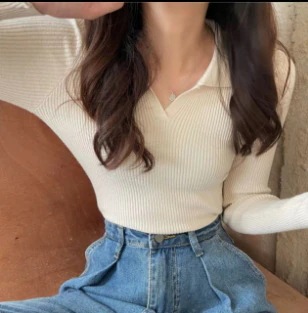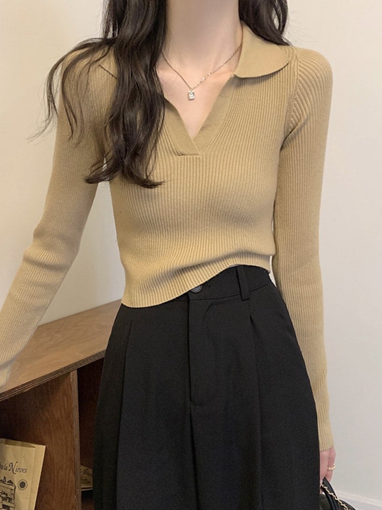 上品なポロカラー長袖ニット 女性の秋冬 フィット感 インナー ショート丈 トップス Vネックインナー