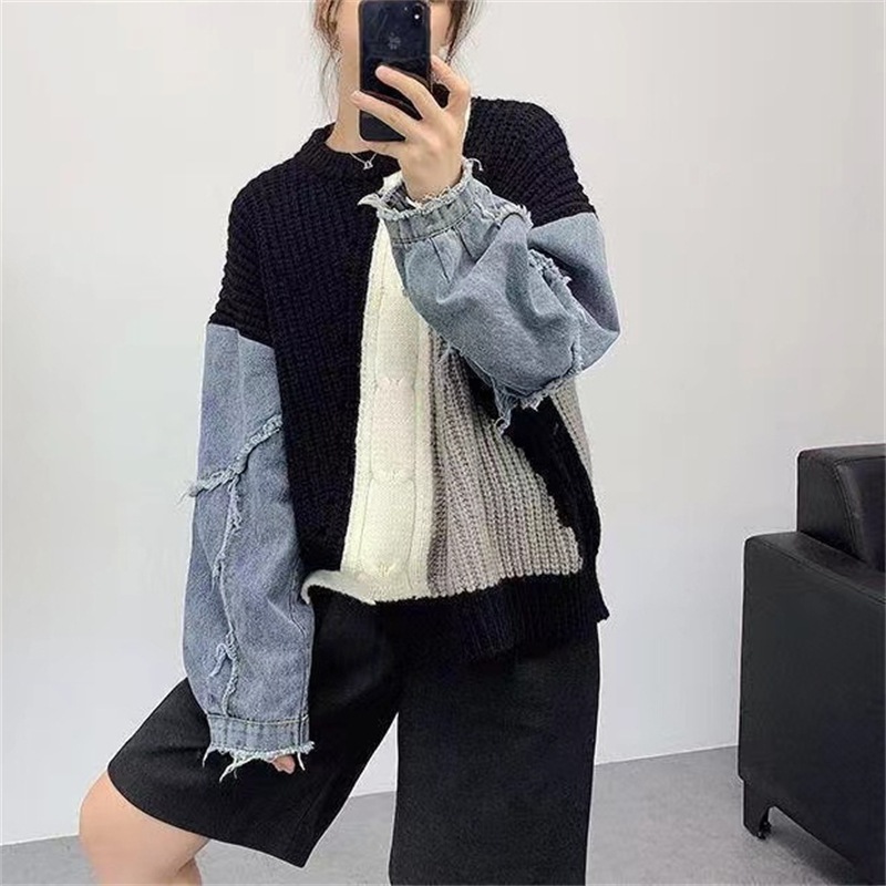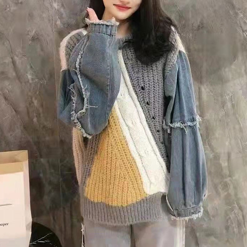 秋冬 ニットカーディガン セーター 万能 韓国風 ゆったり スプライシングプルオーバー レディーストップス