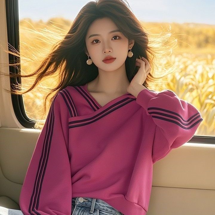 春秋スウェット Tシャツ デザイン感 ストライプ 上着 長袖ブラウス ゆったり レトロ