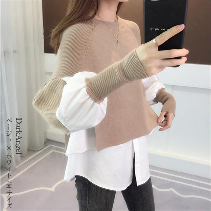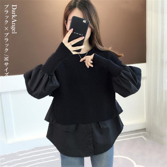 【即納】トップス 異素材 切り替え ニット セーター 長袖 レイヤード風 ドッキング 重ね着風 おすすめ レディース オシャレ トレンド