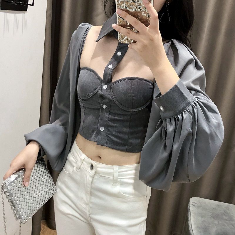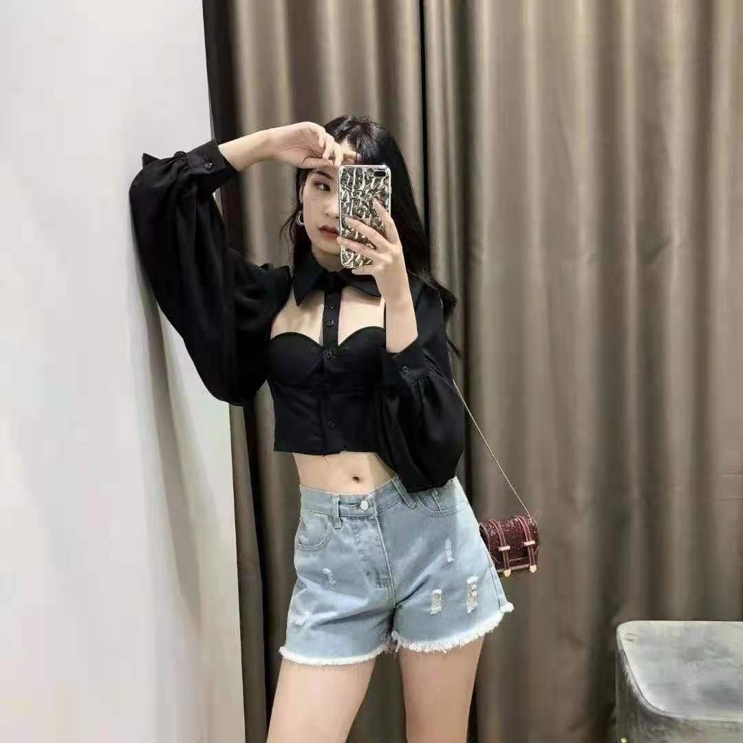 ホルターネック シフォンブラウス トップス レディースファッション ハイウエスト 長袖シャツ セクシー スリミング ショート ブラウス ボトムシャツ