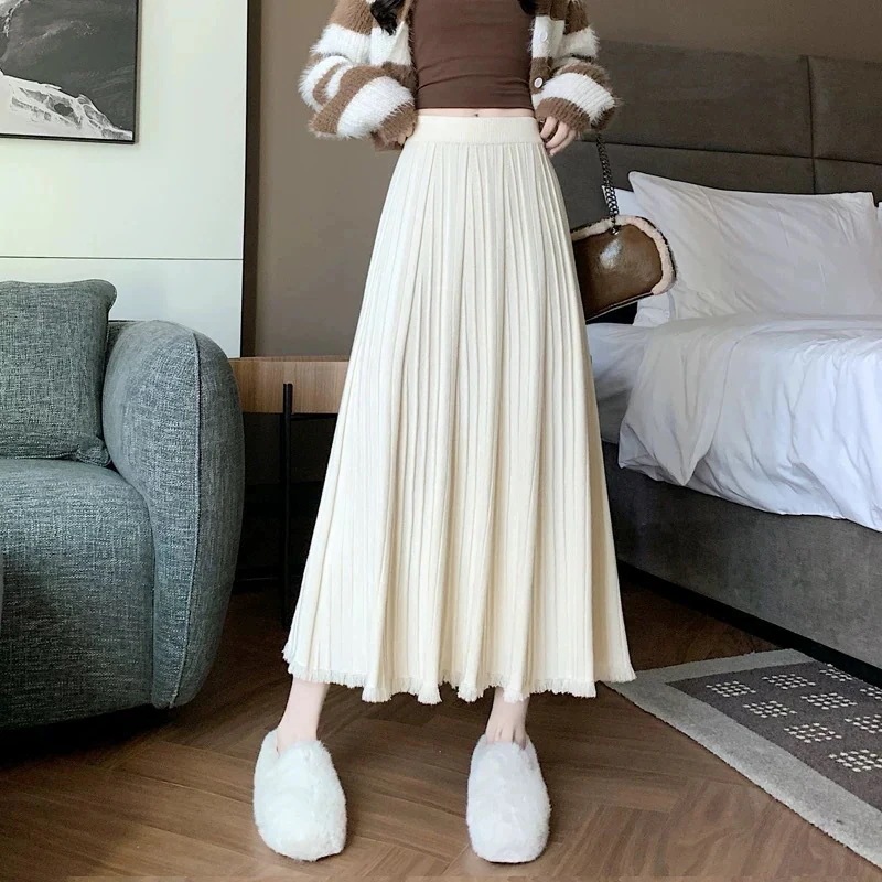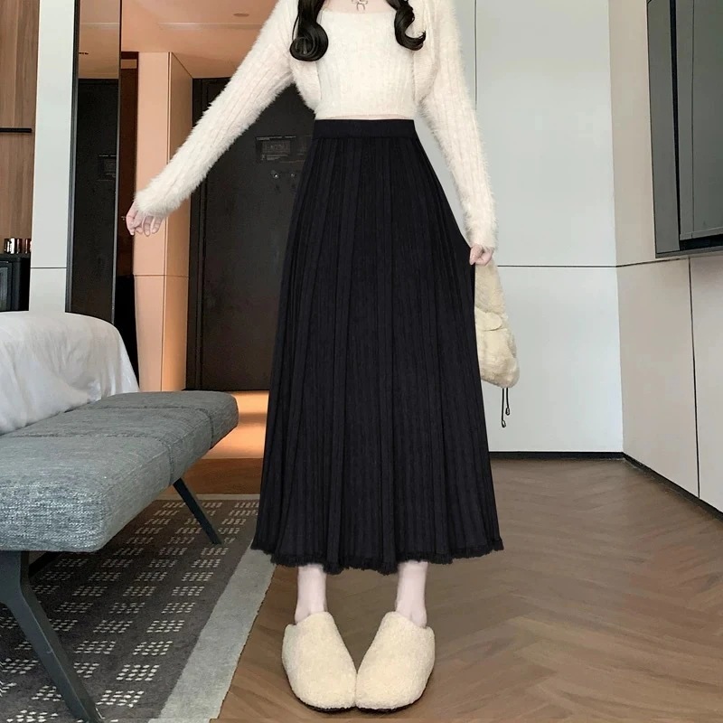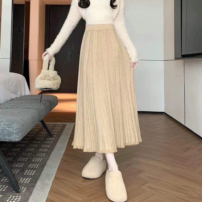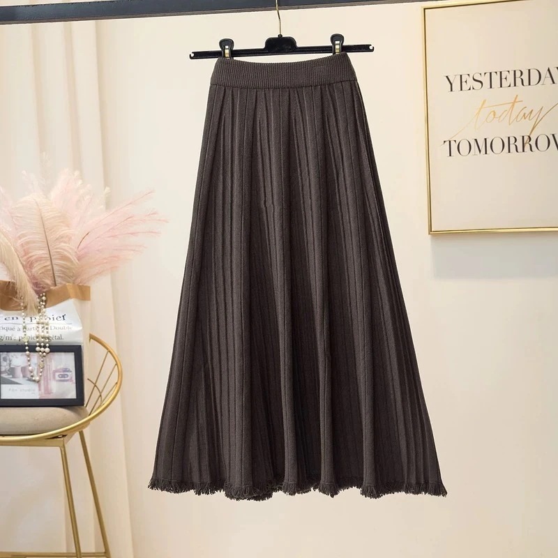 脚魅せミニスカート フレアスカート 新作タッセル麻ひもビスチェ女性秋冬ウール大振りプリーツ一言とろみミディアム丈ニットスカート