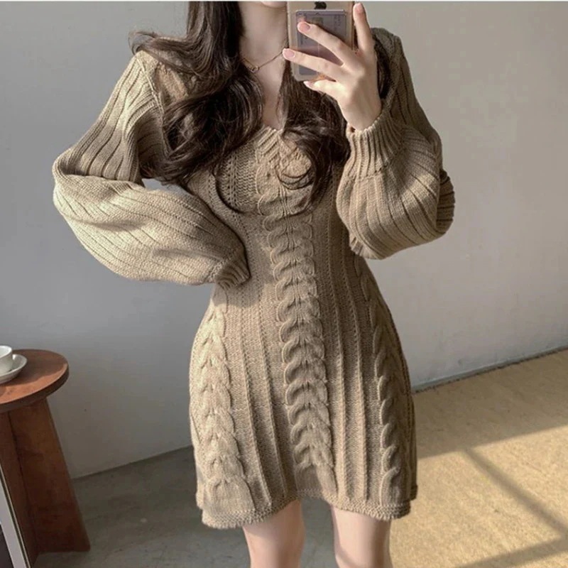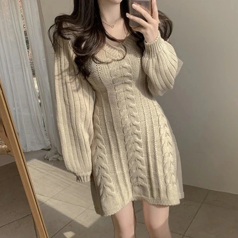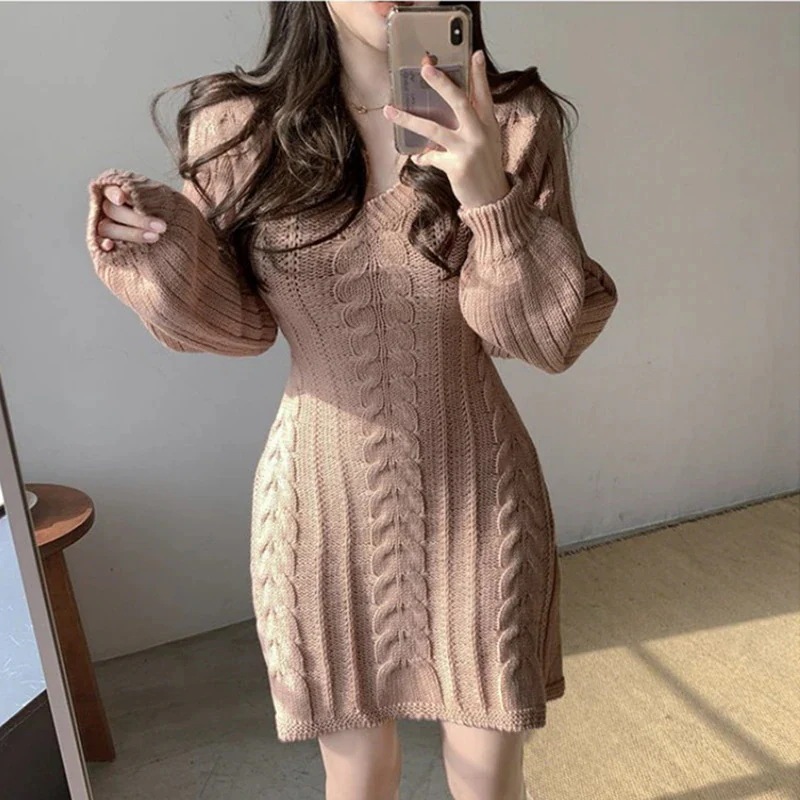 韓国秋物 上品で優しい雰囲気のVネック編み込み柄デザインスリムシルエット長袖のボディコンニットワンピース