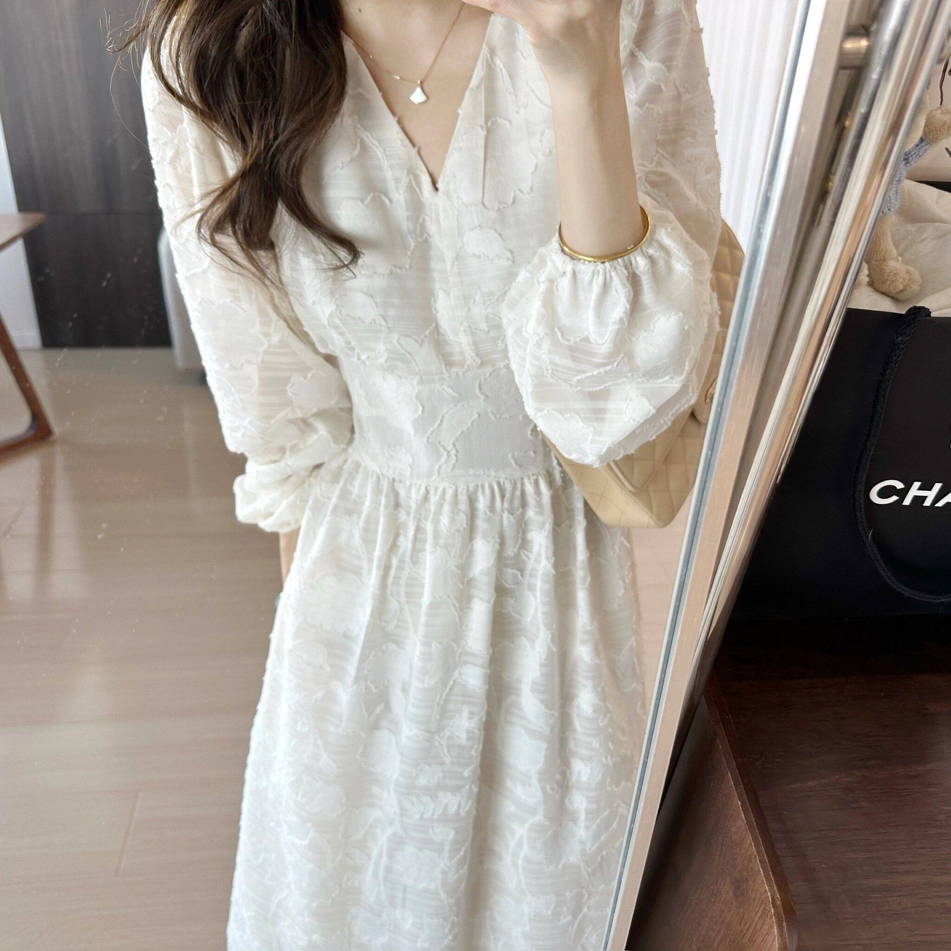 韓国 優しい雰囲気のロングスリーブワンピース2026年春秋 可愛らしい 爽やかなVネックジャカード柄でウエストを絞ったスリム効果ロングドレス