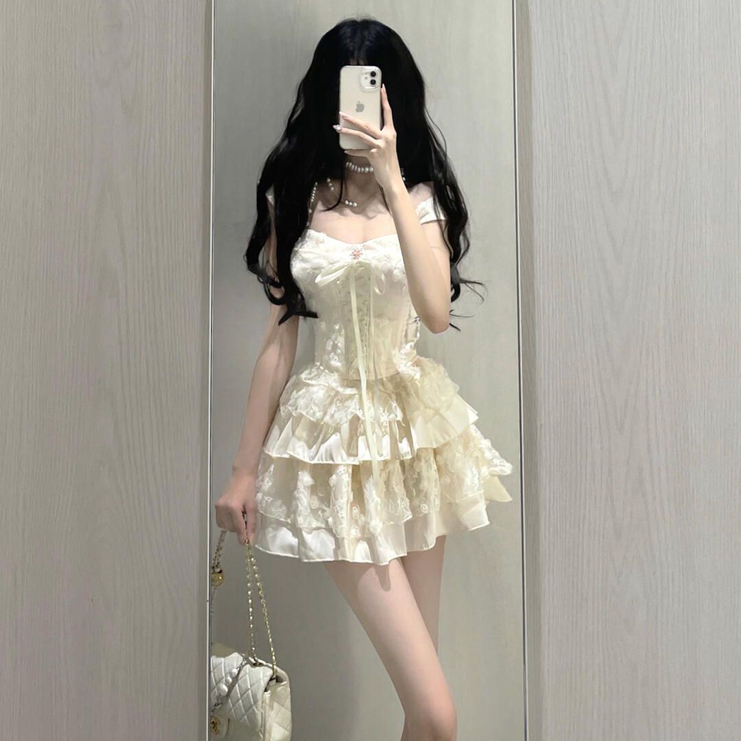 二点セット スーパーハイエンド感情純粋で甘いホットガールレースサスペンダートップケーキスカート2ピースセット