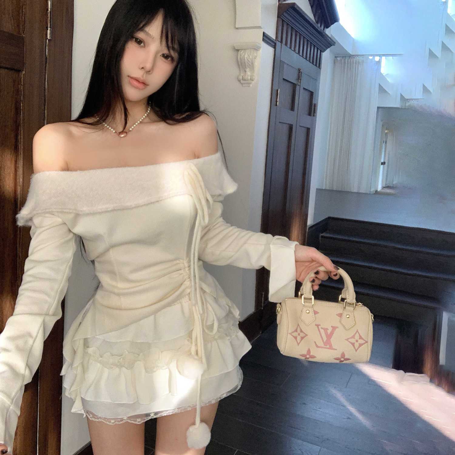 二点セット 片肩の白い長袖セータードローストリングスリムボディショートフラッフィースカート2ピースセット