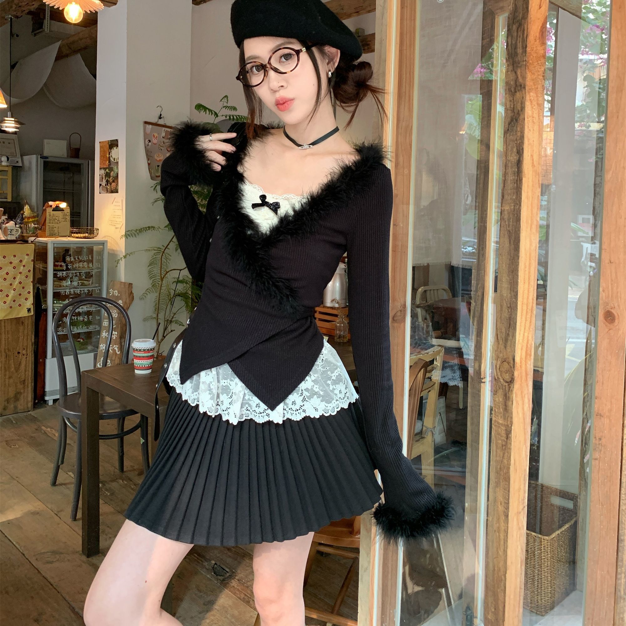 二点セット 毛皮のようなスプライシングデザインvネックカーディガントップサスペンダーベストプリーツスカート3ピースセット