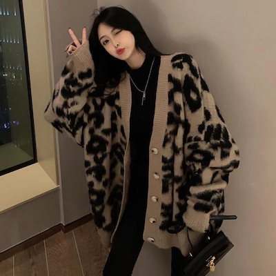 S-6XL ゆったり大きいサイズ 春 ニットカーディガン レディース 韓国ファッション 春アウター 怠惰な風 体型カバー ニットセーター 流行り 豹柄 ニットトップス