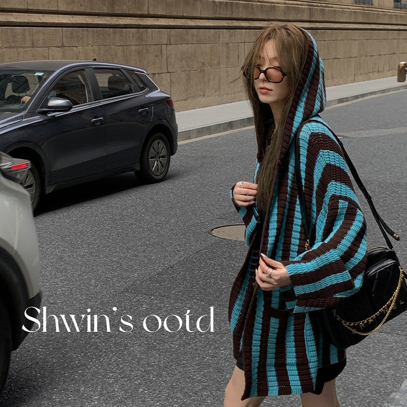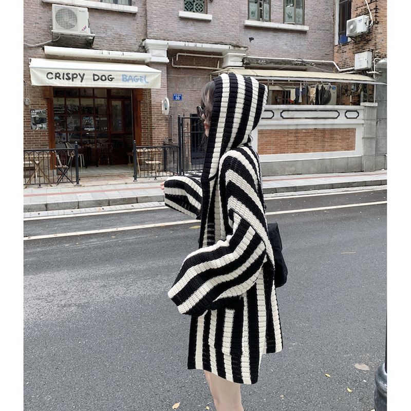 春冬新作 ニットカーディガン ストライプフード付きニットアウター ゆったり 怠惰な風 カーディガン レディース 韓国ファッション 百掛け 大きいサイズ体型カバー トップスセーター パーカー