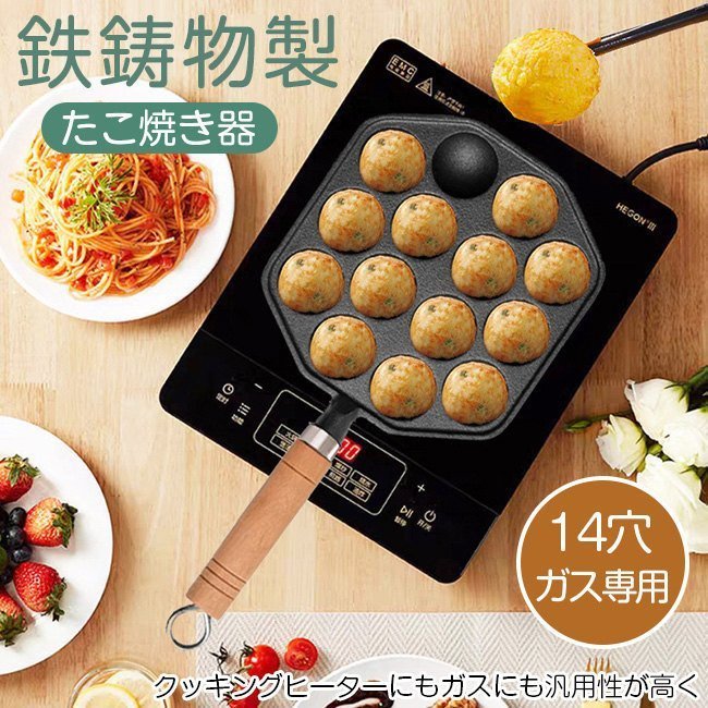 クッキングヒーター ガス火用 汎用性高い たこ焼き器 14穴 木柄付 たこ焼き プレート 鉄鋳物製