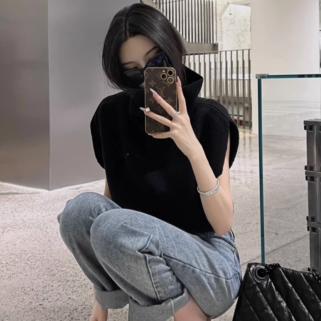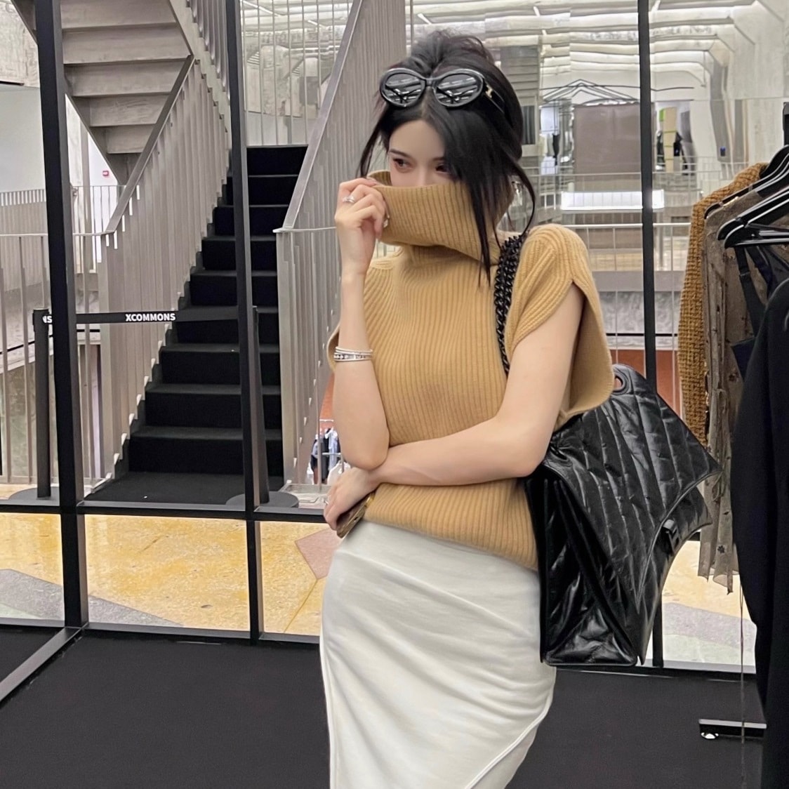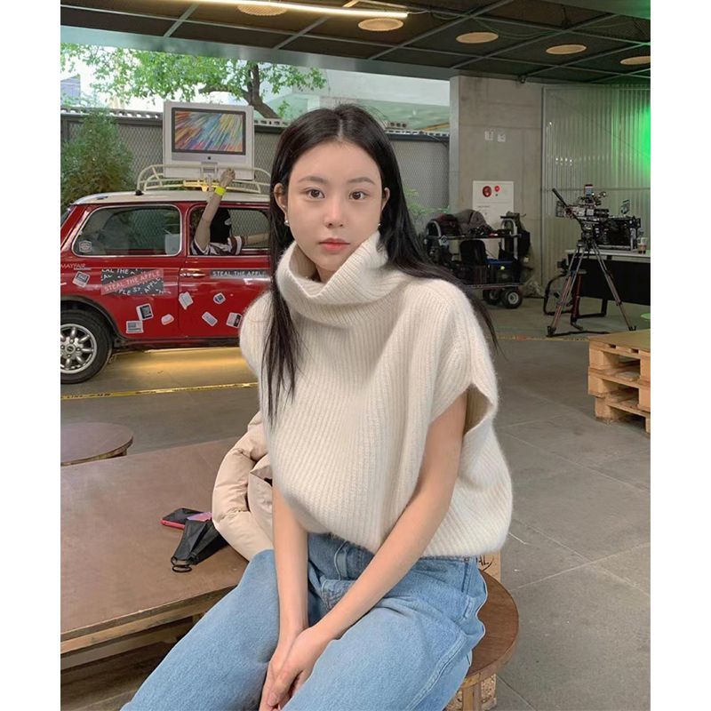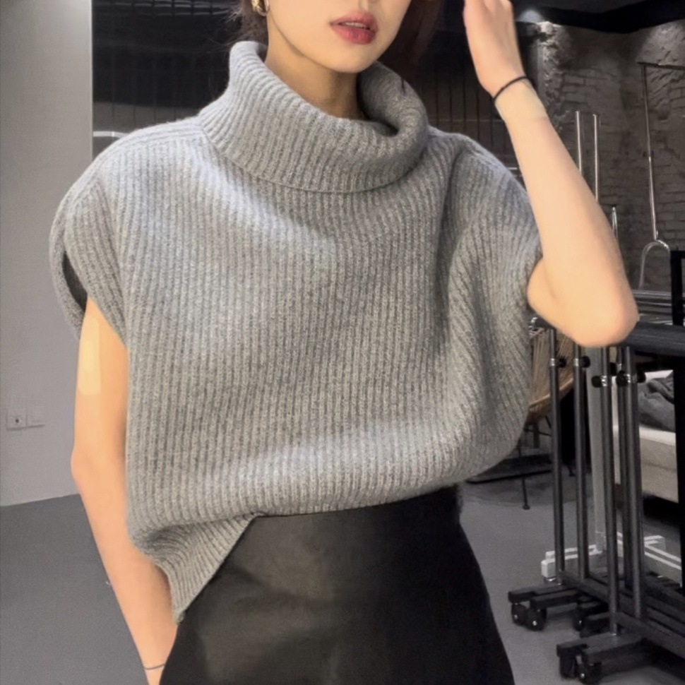 Insの怠惰な風の高襟のニットウェアの女性は簡単に厚くなって袖のないベストベストのベストセーターを重ねて着ている