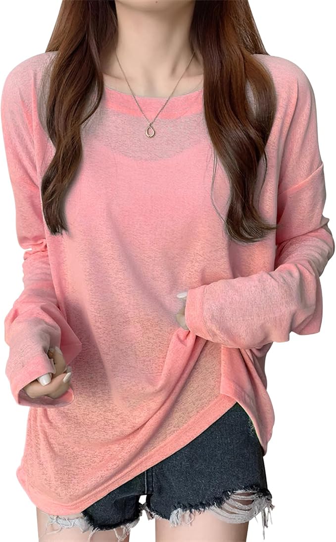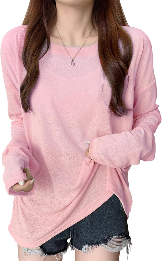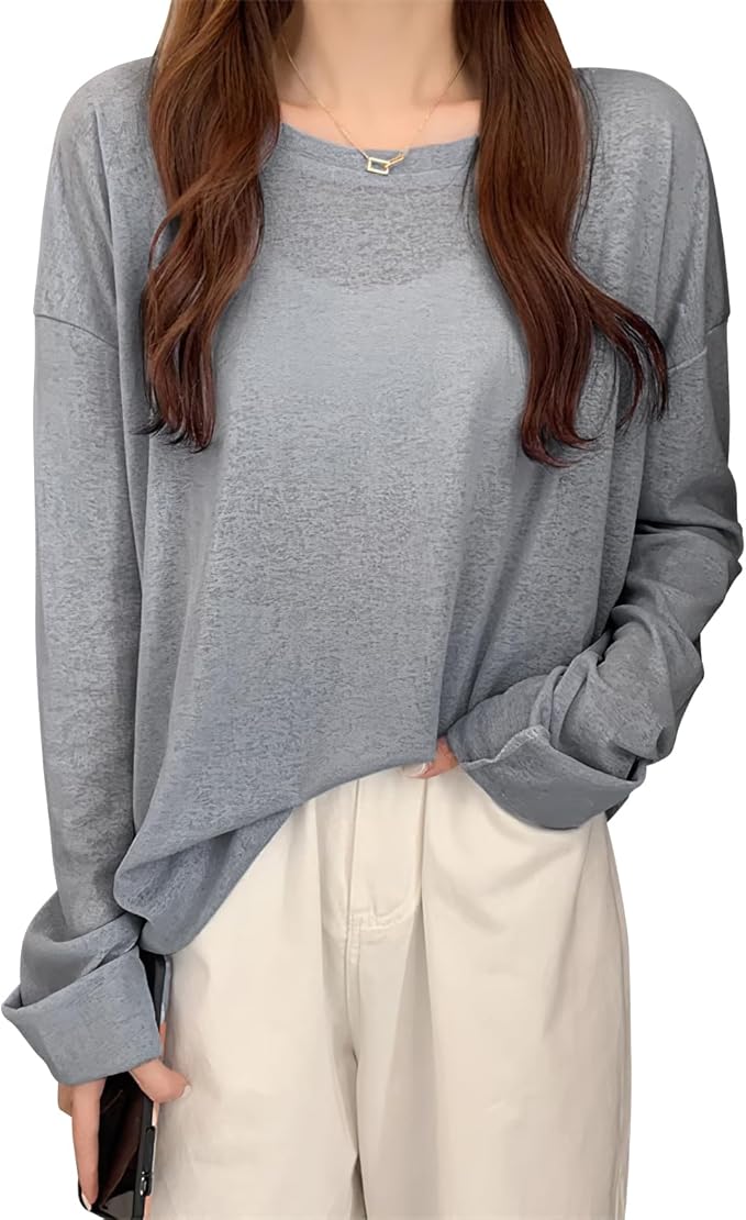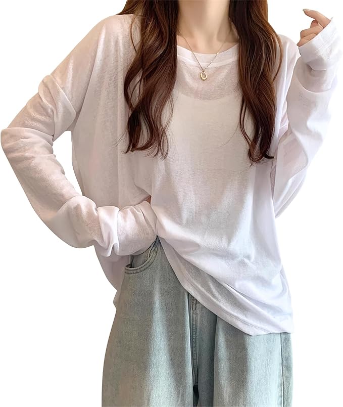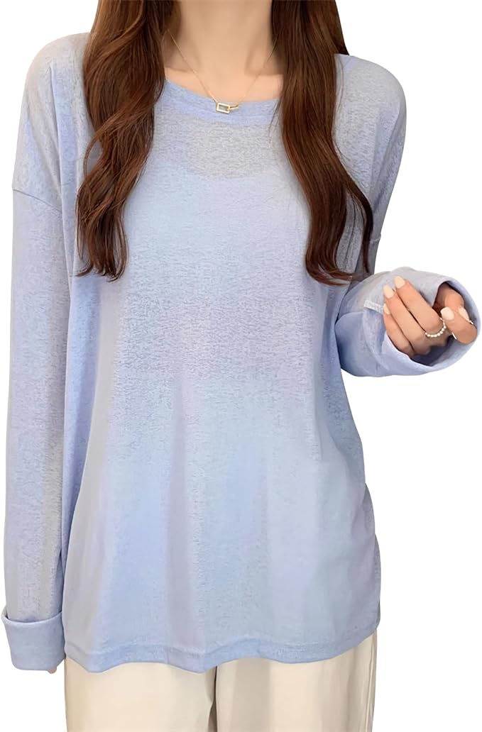 Tシャツ ブラウス レディース トップス 長袖 日焼け防止 透け感のあるデザイン 体型カバー効果 MAX 薄手 重ね着 UVカット クルーネック 透け 無地 丸襟 ゆったり 快適 吸汗性 通気性
