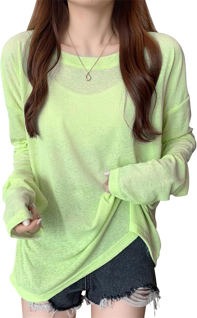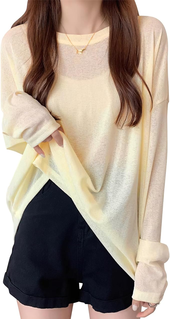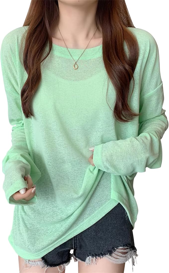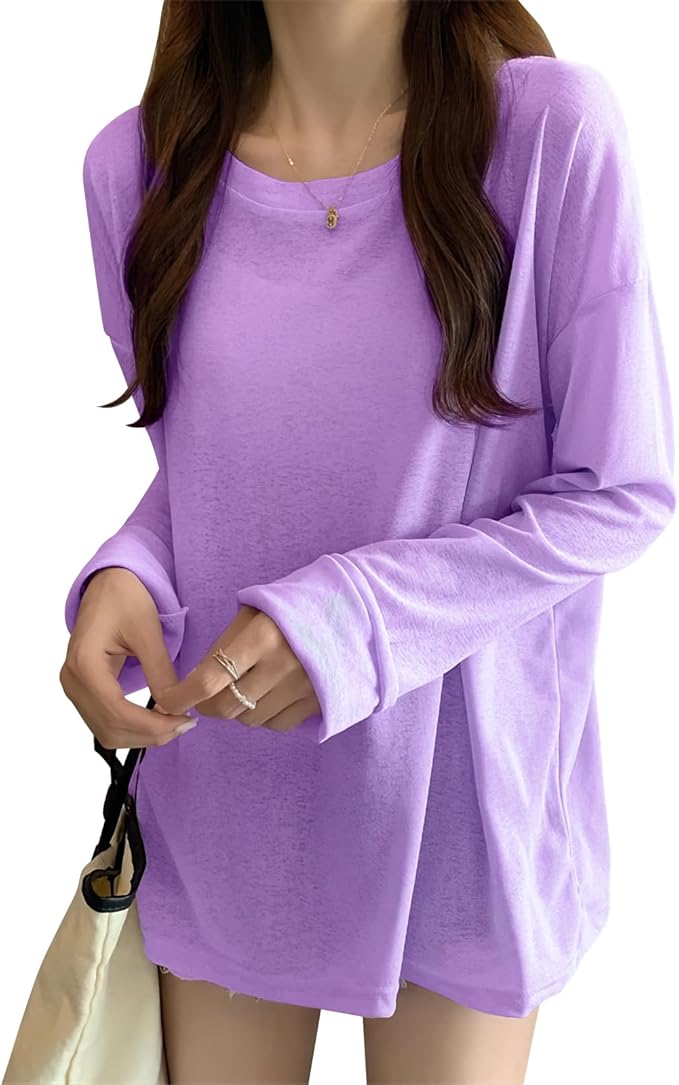Tシャツ ブラウス レディース トップス 長袖 日焼け防止 透け感のあるデザイン 体型カバー効果 MAX 薄手 重ね着 UVカット クルーネック 透け 無地 丸襟 ゆったり 快適 吸汗性 通気性