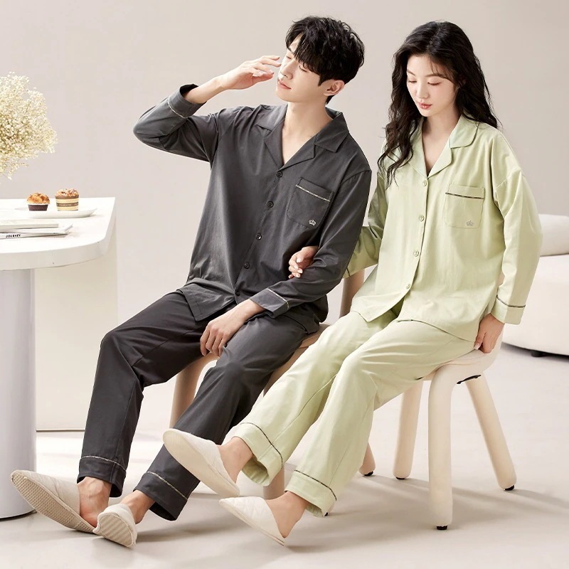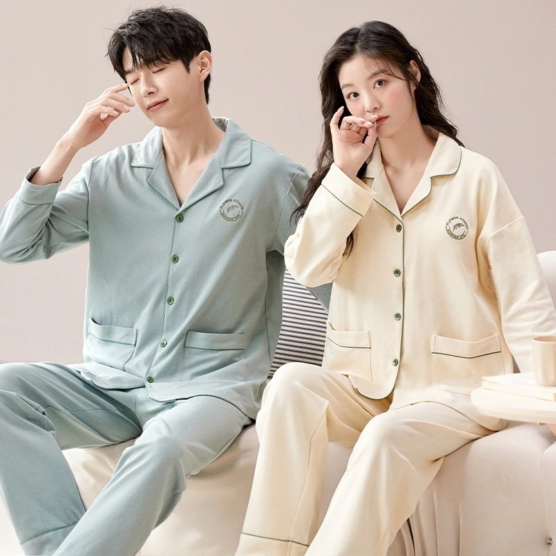 カップルパジャマ長袖ズボン大きいサイズ春と秋のホームウェアフロントボタンセット