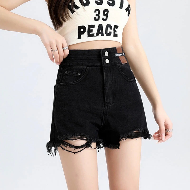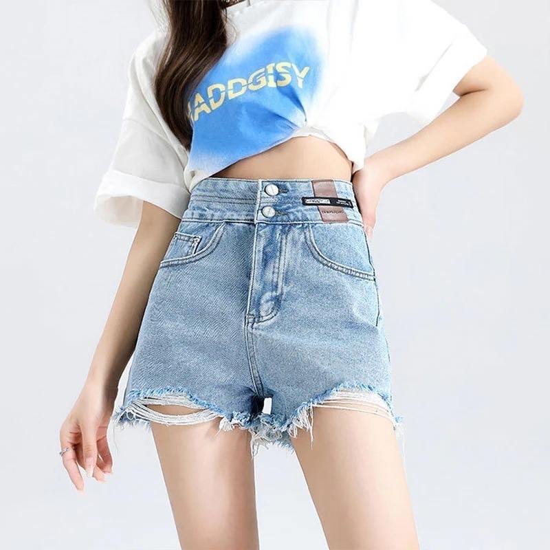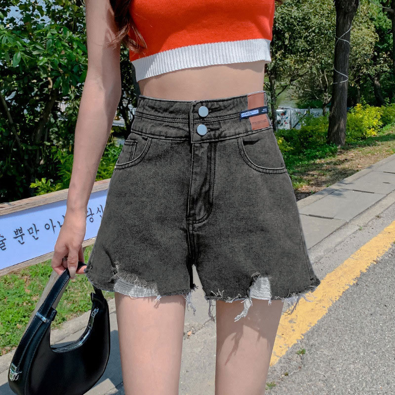 バリデニムひんやりボトム 革のブランドのダブルボタンのハイウエストinsのダメージジーンズ 脚見せ ショートパンツ
