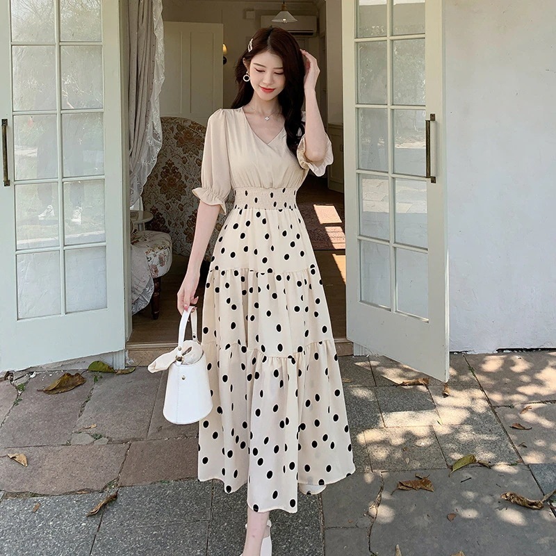 24 Vネック アンズ色 はてん ロングスカート ル袖 ウ引き締め 着痩せ 甘い 偽2件 涼しい ビーチスカート