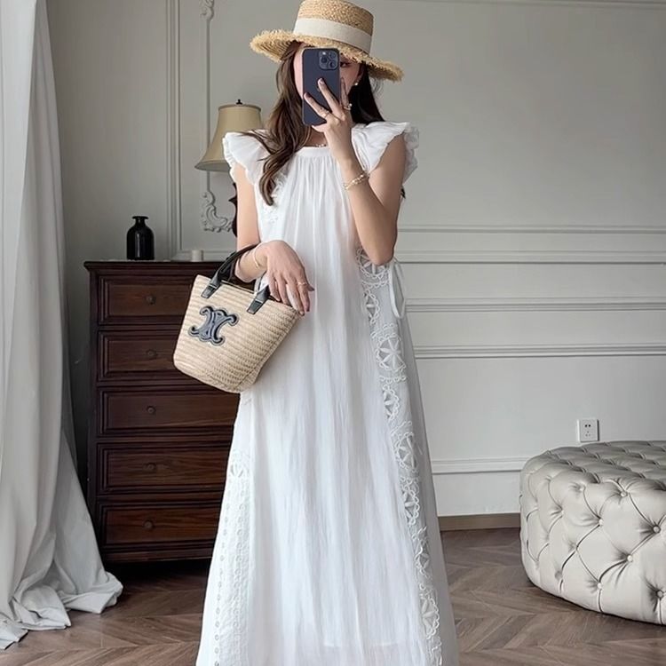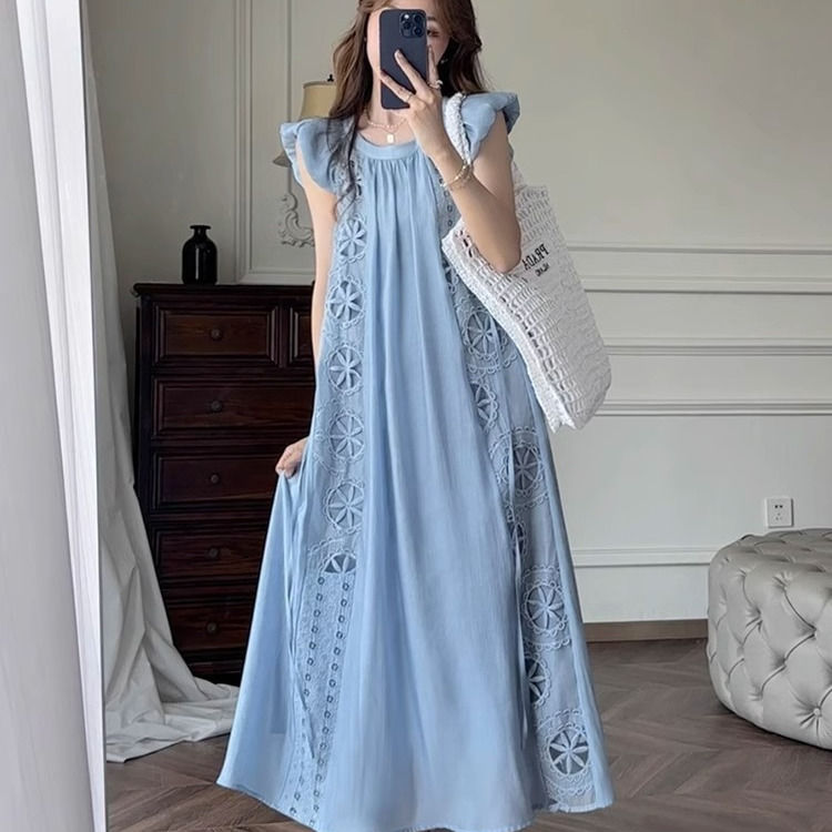 フランス レトロ サマー やさしい 新しい 刺繍 飛び袖 ワンピース ドーパミン ブルー ホワイト デザインセンス スカート