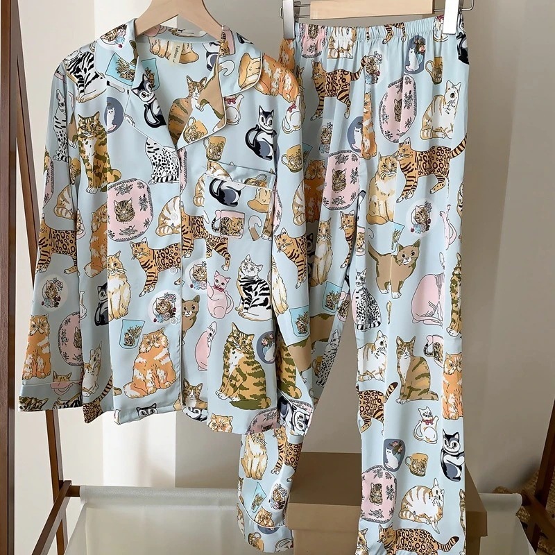 パジャマ スリープウェア 女性 春と秋 アイスシルク 長袖 夏 キャッツ ルームウェア