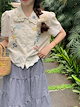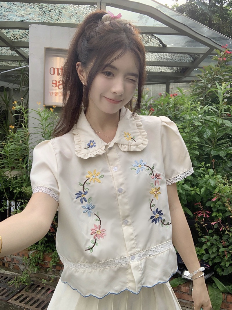 レトロスウィート花柄刺繍ドールネックシャツ女2025年夏新作デザインシックな半袖トップス