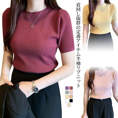 セーター Tシャツ 春 無地 レディース クルーネック リブ サマーニット 伸縮性 クルーネック 半袖 きれいめ おしゃれ 清楚 30代 秋 夏 重ね着 通勤 オフィス 20代 トップス