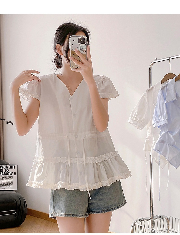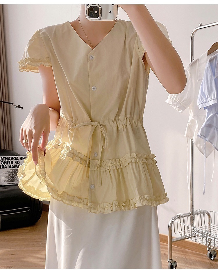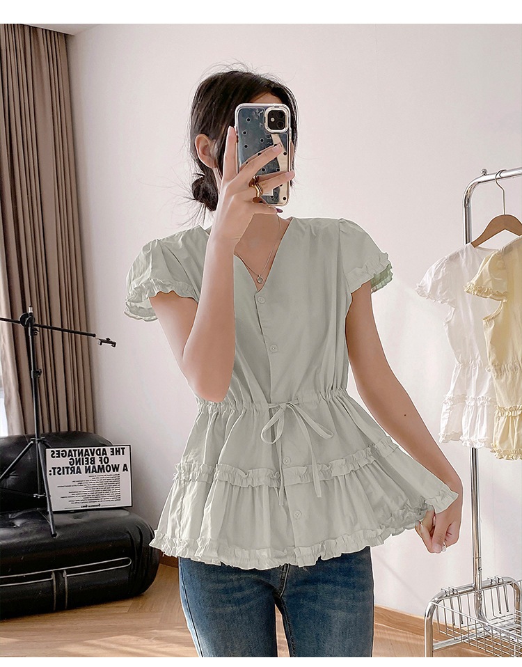 2025夏モデル日系Vネックドローストリングウッド耳元デザイン半袖シャツ