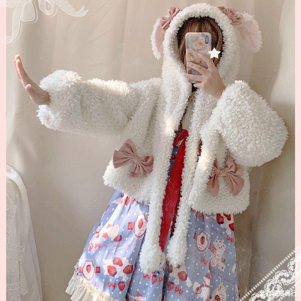 早いもの胜ち 動くうさ耳ロリータショートコートロリータスプリングコート4点セットリボンファーボール取り外し可能