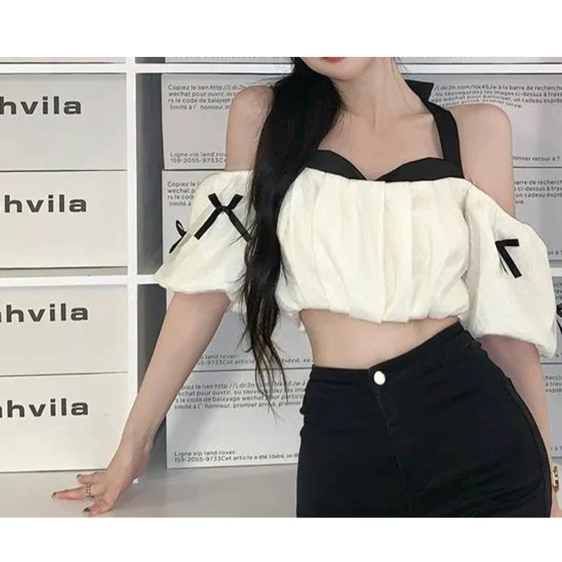 デザイン感ニッチシックな シャツ一字肩掛け首掛け甘いリボンバブル袖短い上着女性服