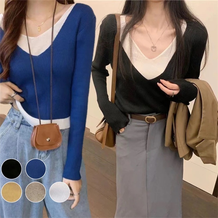 新规入荷続々 フェイクレイヤードニットソー Vネックニットトップス ニット レディーストップス 韓国ファッション