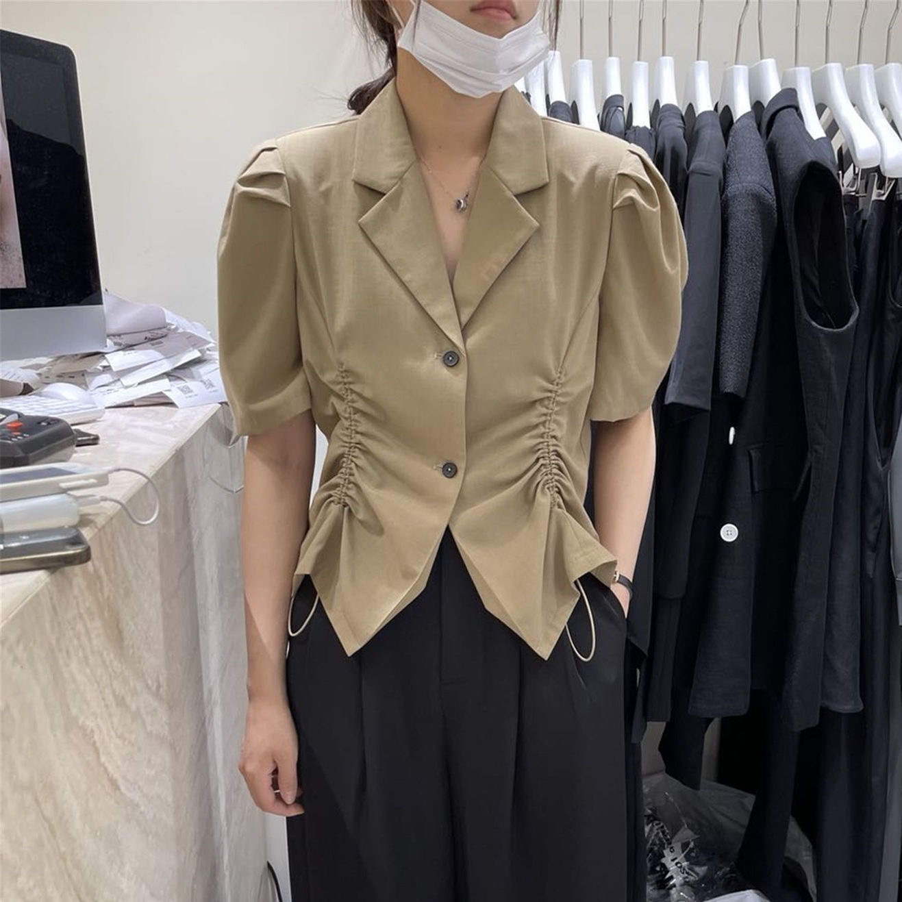 激安セール 季の のフランス式の下でV縄のしわを引いて腰のシャツの女性のスーツの襟の上着を収めます