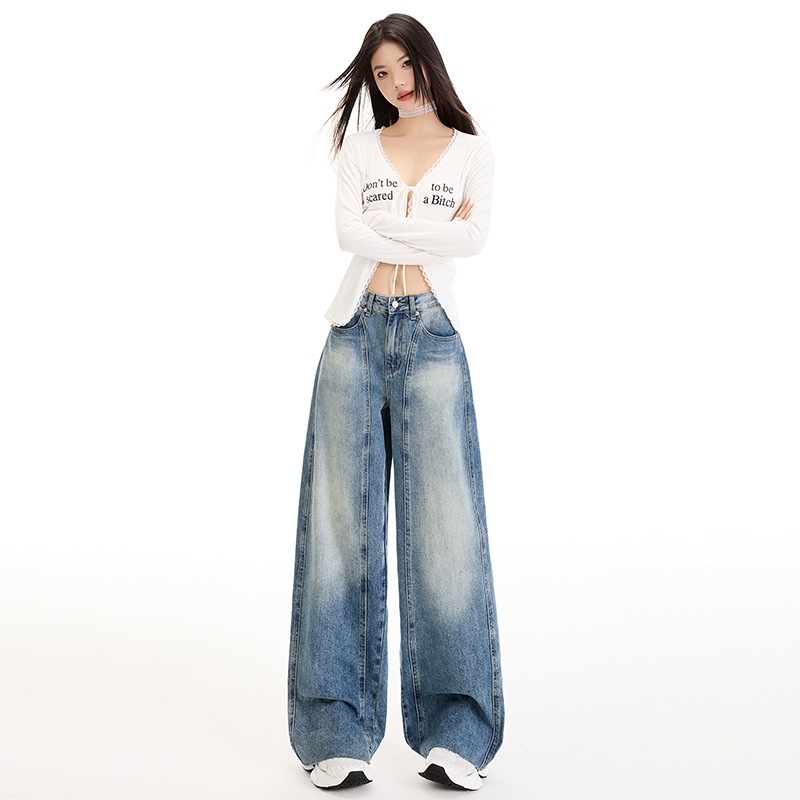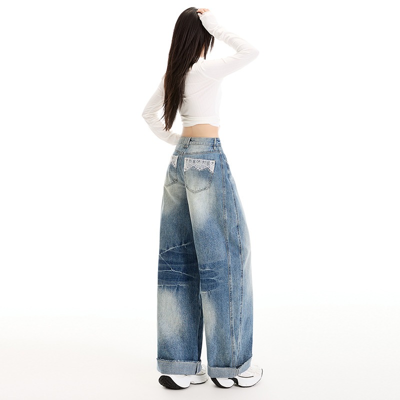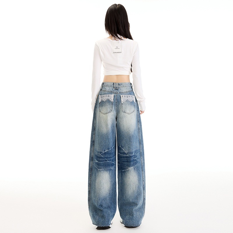 レースバックポケットパッチワークデザインワイドレッグジーンズ女性用ハイウエストスリムニッチモップパンツ
