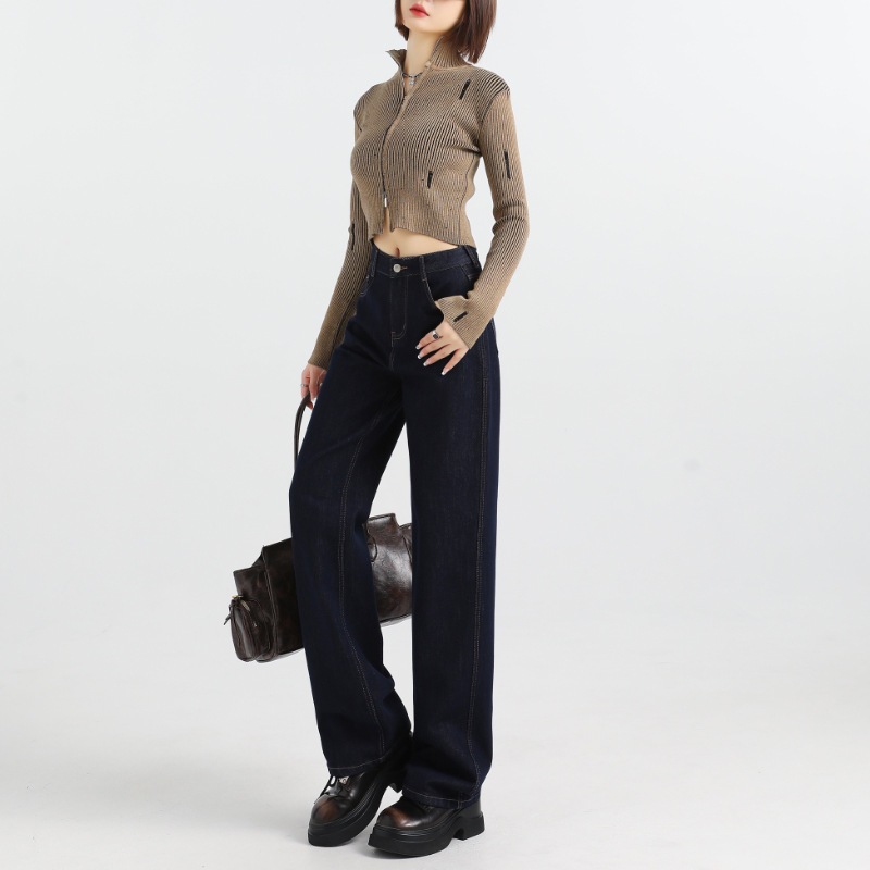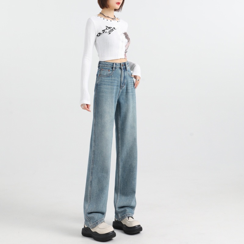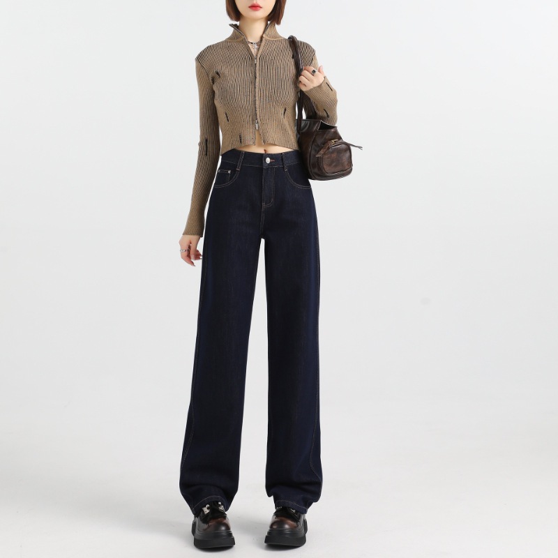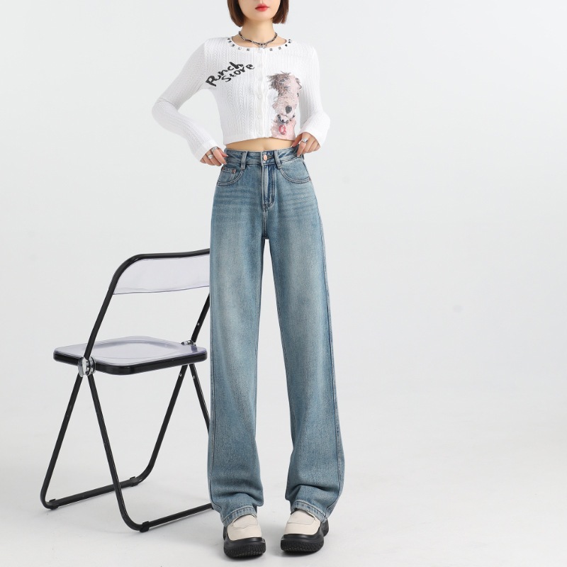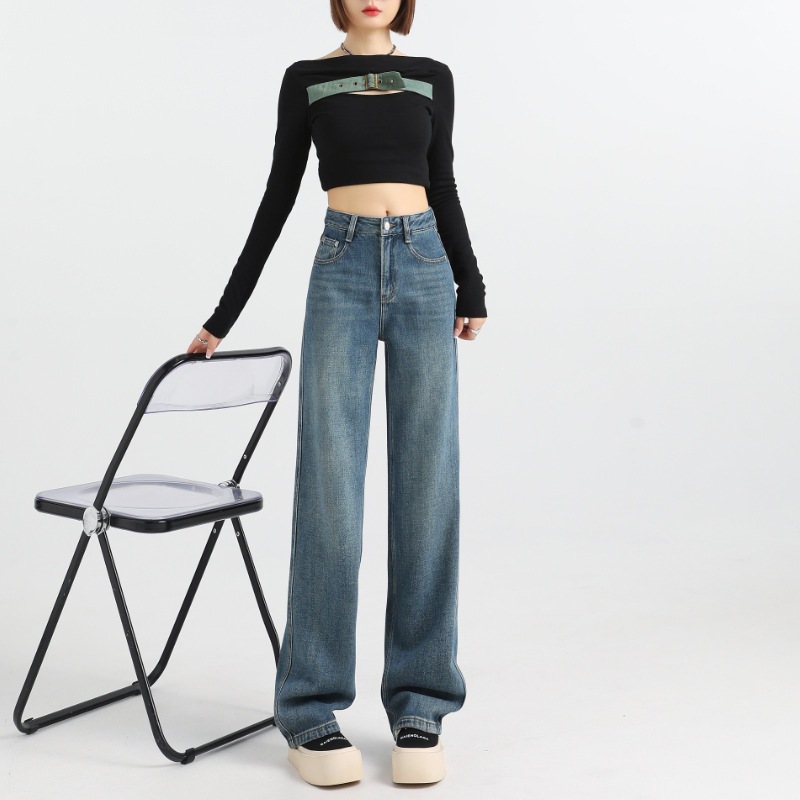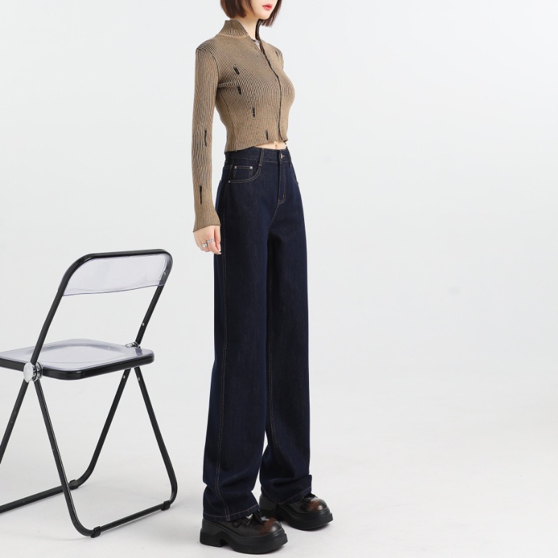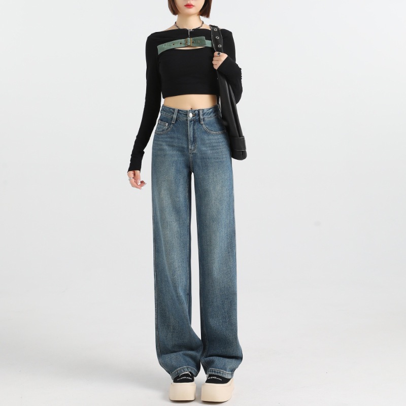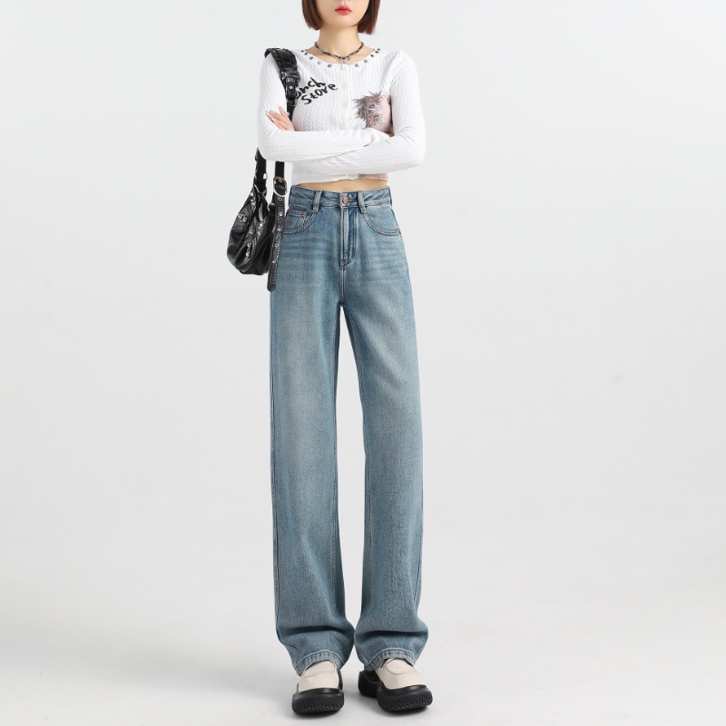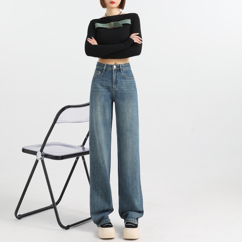 女性用の高級ナローレッグジーンズドレープ感のあるハイウエストゆったりとスリム万能なフロアレングスのストレートパンツ