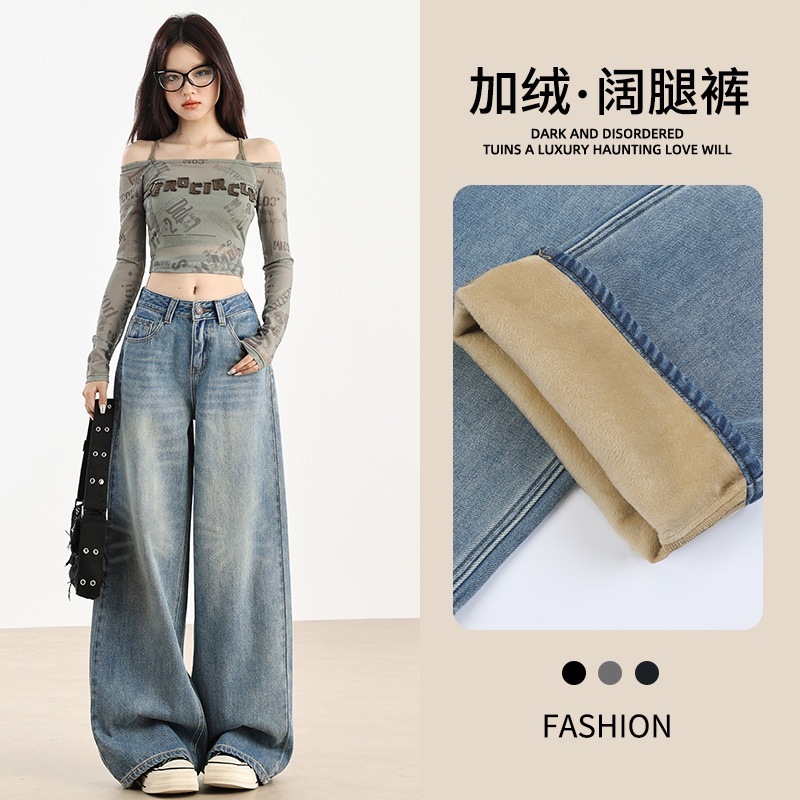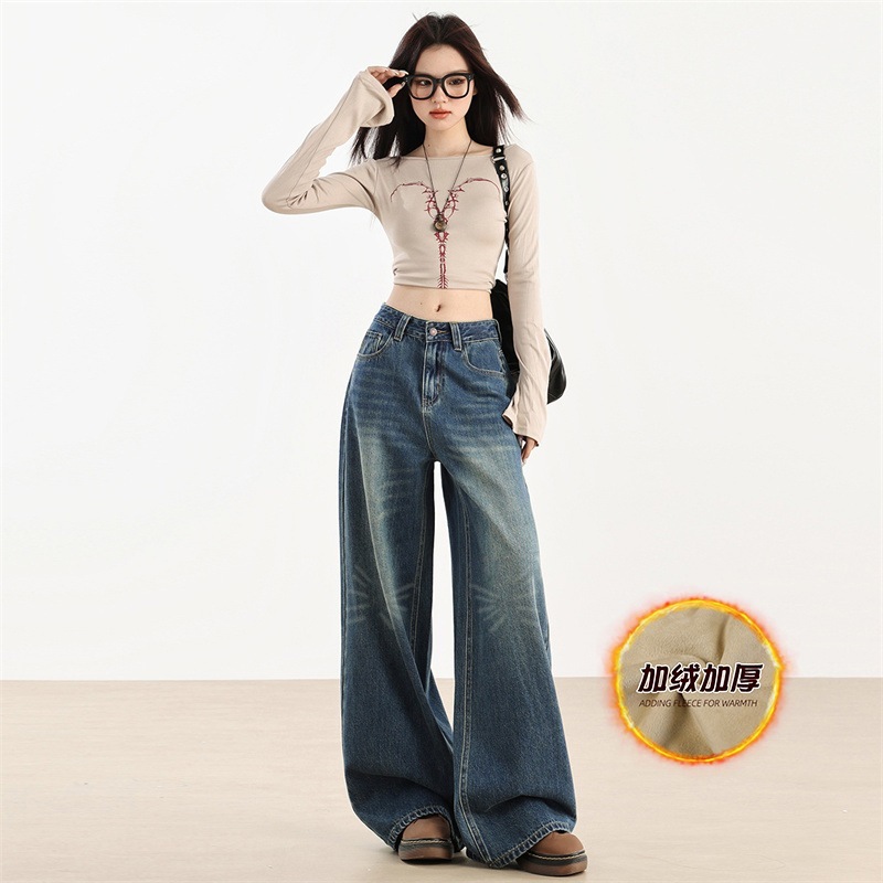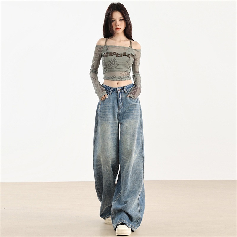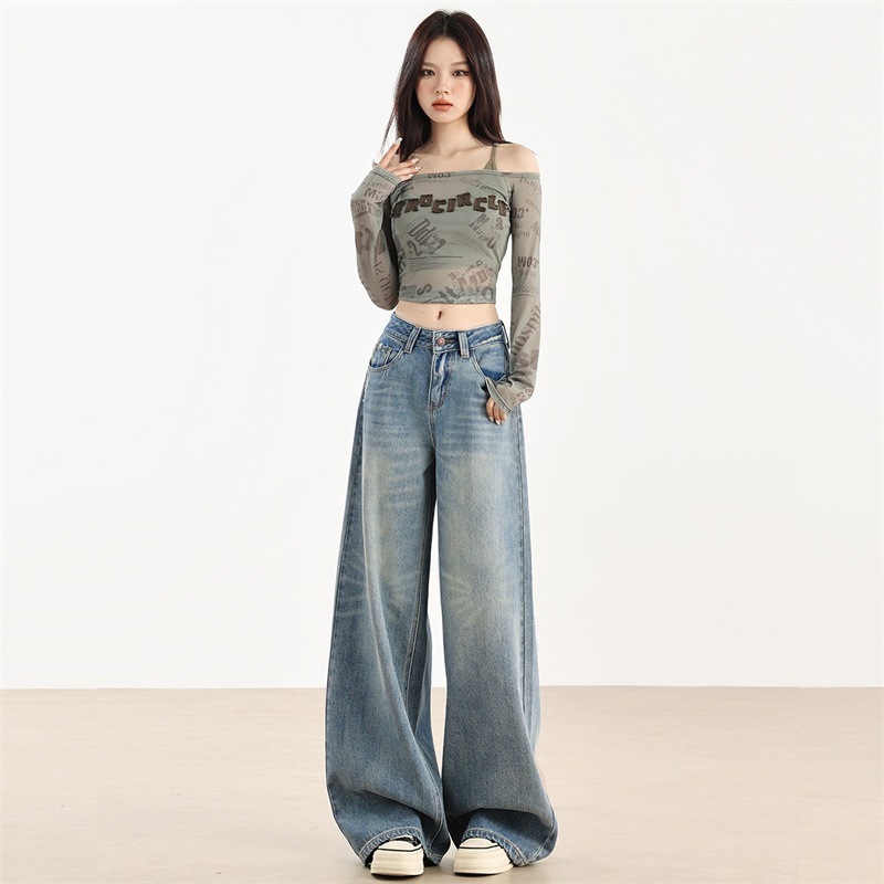 ライトブルーウォッシュ花火柄ワイドレッグジーンズレディース2025ハイウエストルーズスリミングハイエンドストレートパンツ