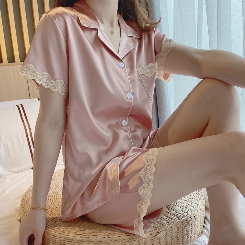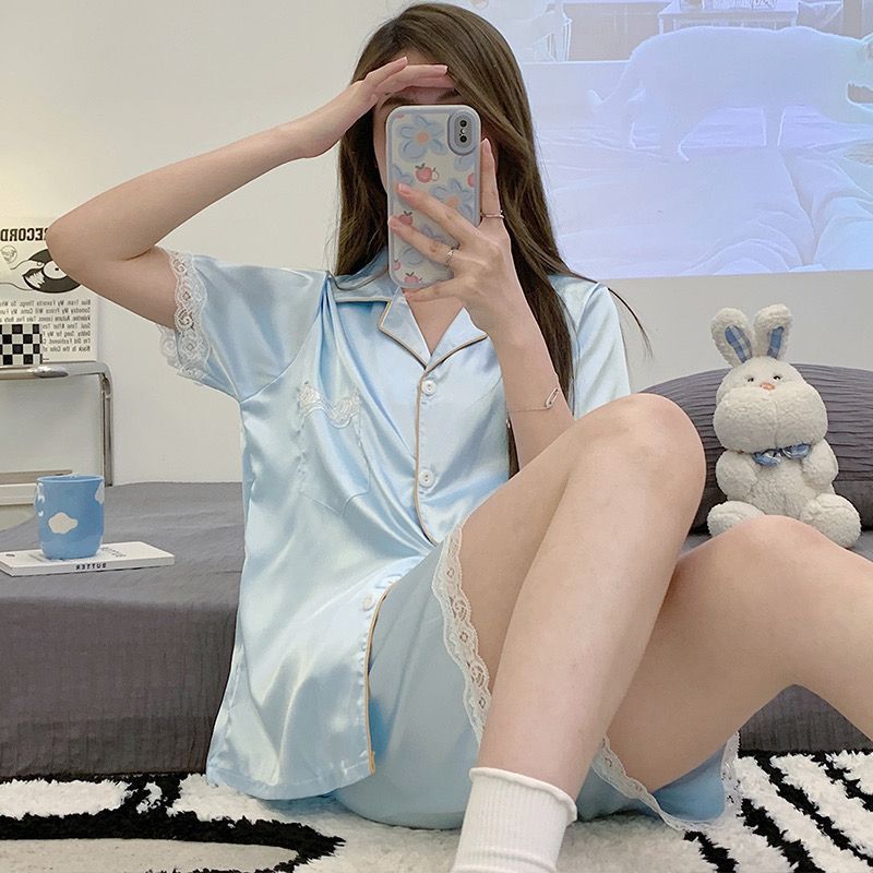 新しいスタイル アイスシルクパジャマ 夏 半袖ショーツ 薄い部分 新しい 高級レースシルクホームスーツ パジャマ 前開きパジャマ ルームウェア パジャマ レディース パジャマ 夏 パジャマ 韓国
