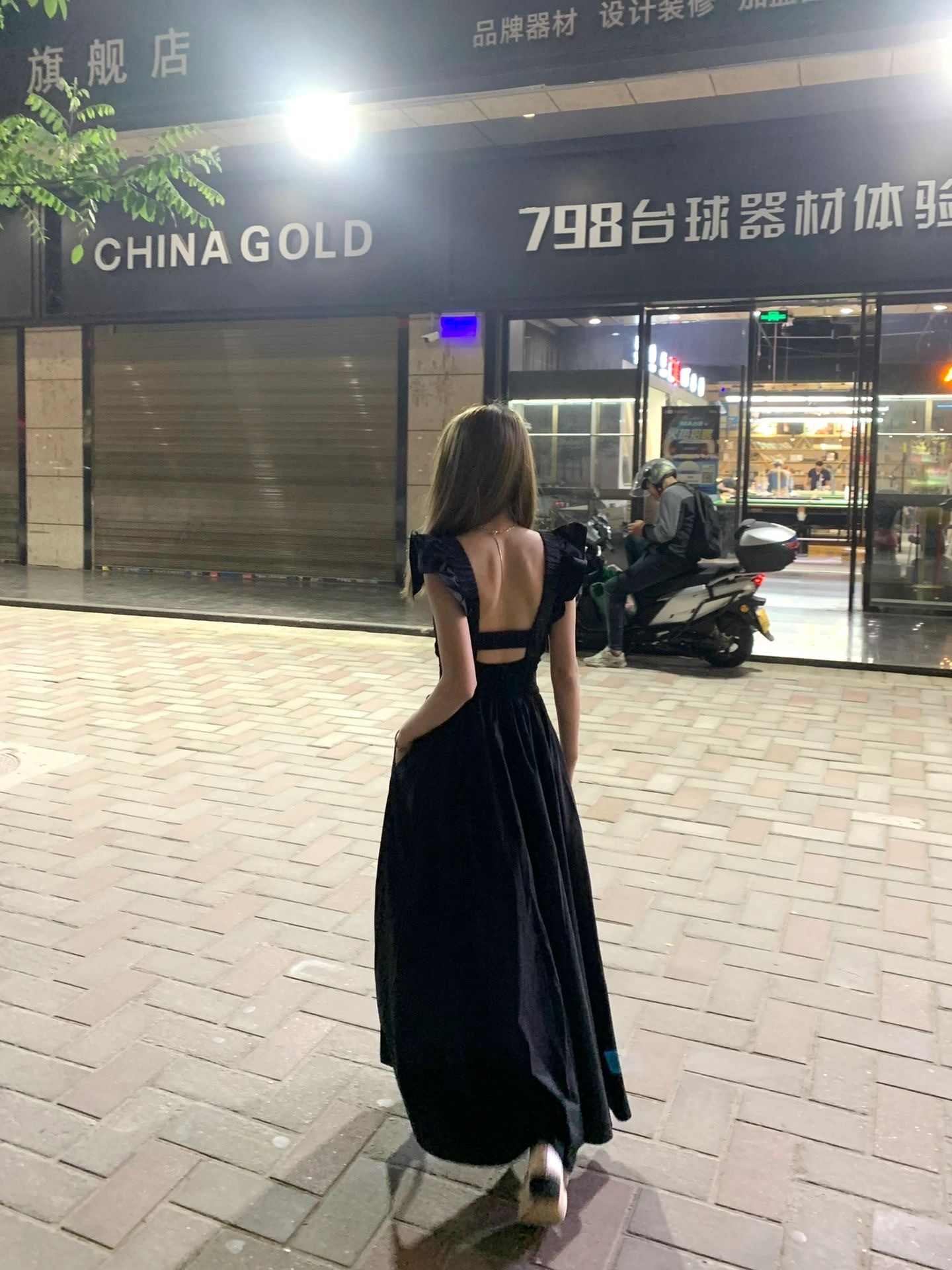 バックレスバケーションスタイルスモールフライングスリーブサスペンダードレス夏ウエストヘップバーンスタイルリトルブラックドレス高級ロングスカート