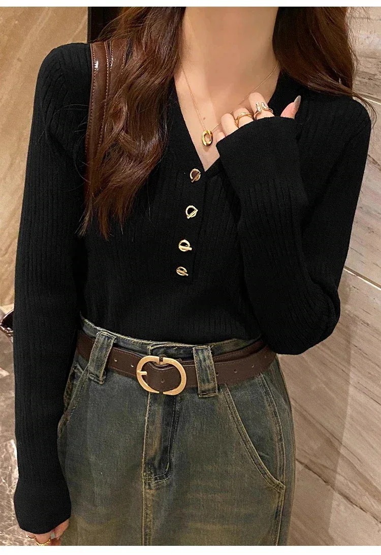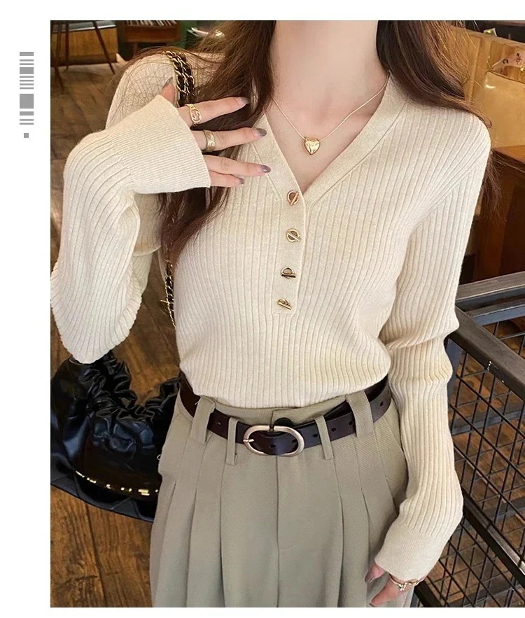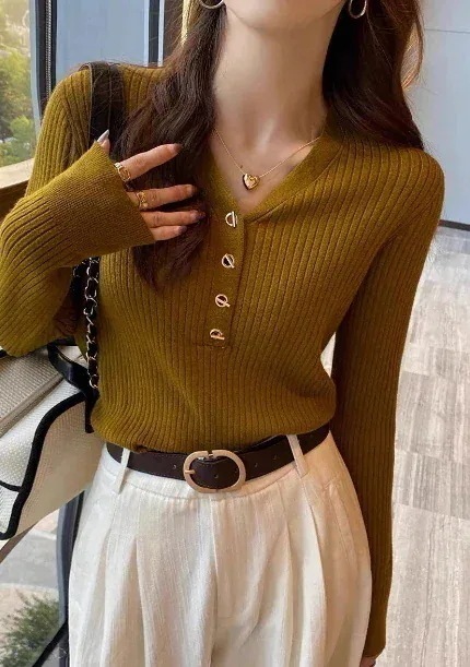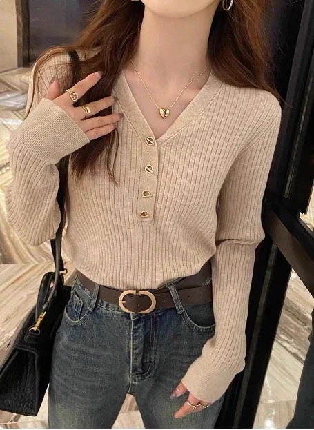 秋冬ファッションなリブニットシンプルカシミヤタッチ ニットセーター 百掛けトップス ニットインナーVネックベーシックニットスウェット長袖リブニット