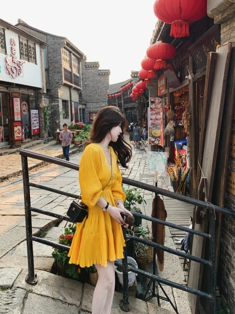 黄色茶歇桔梗v领连衣裙高级感收腰显瘦小个子海边度假裙