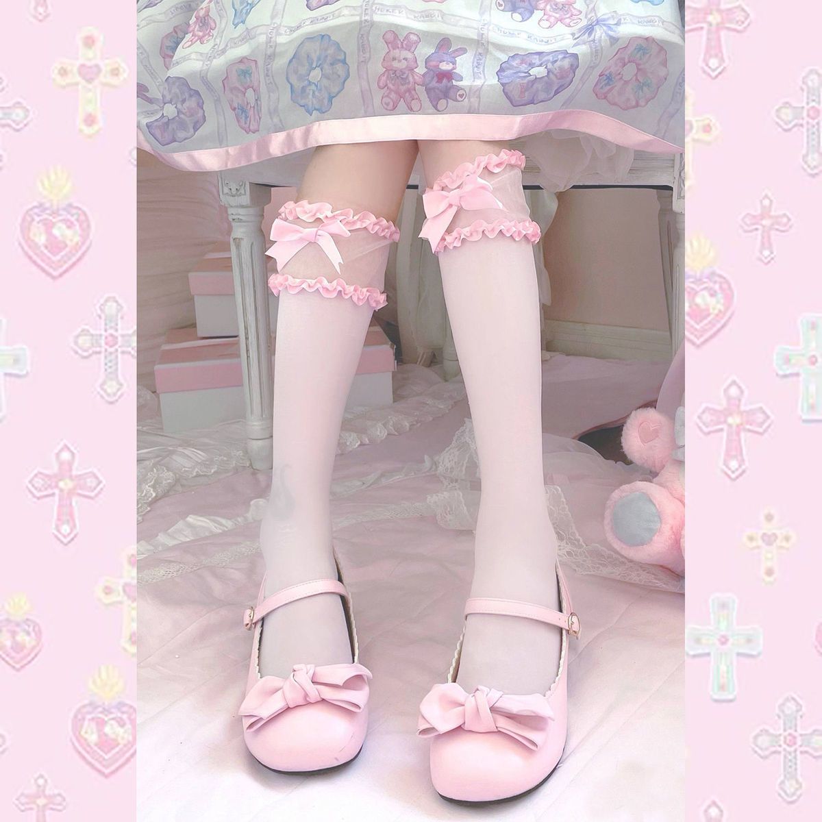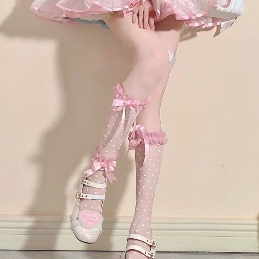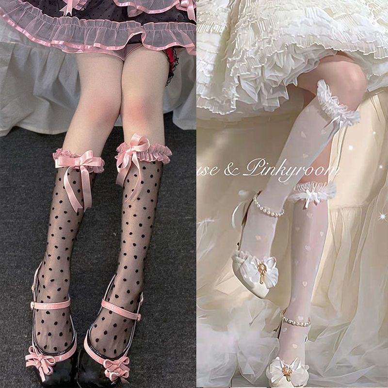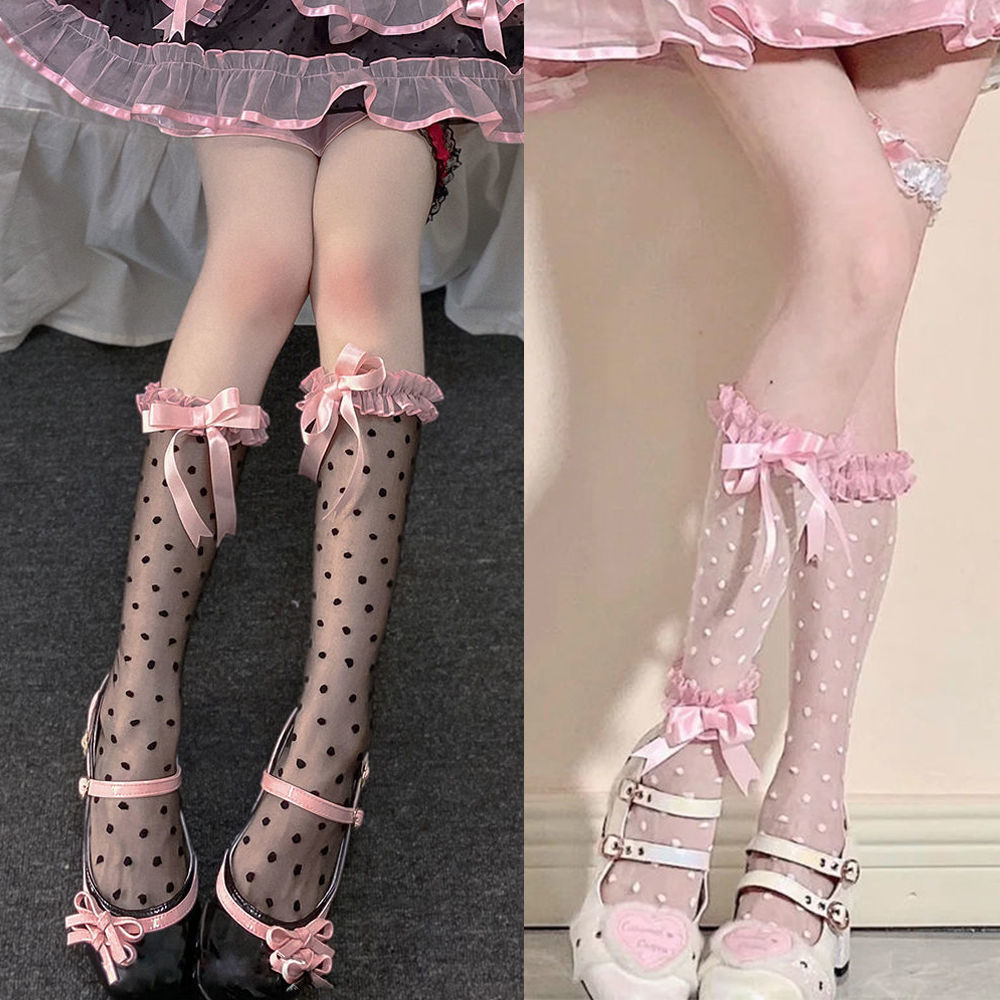 日本製ロリータピンクちょう結び水玉レースショートミッドブふくらはぎソックス女の子夏薄部